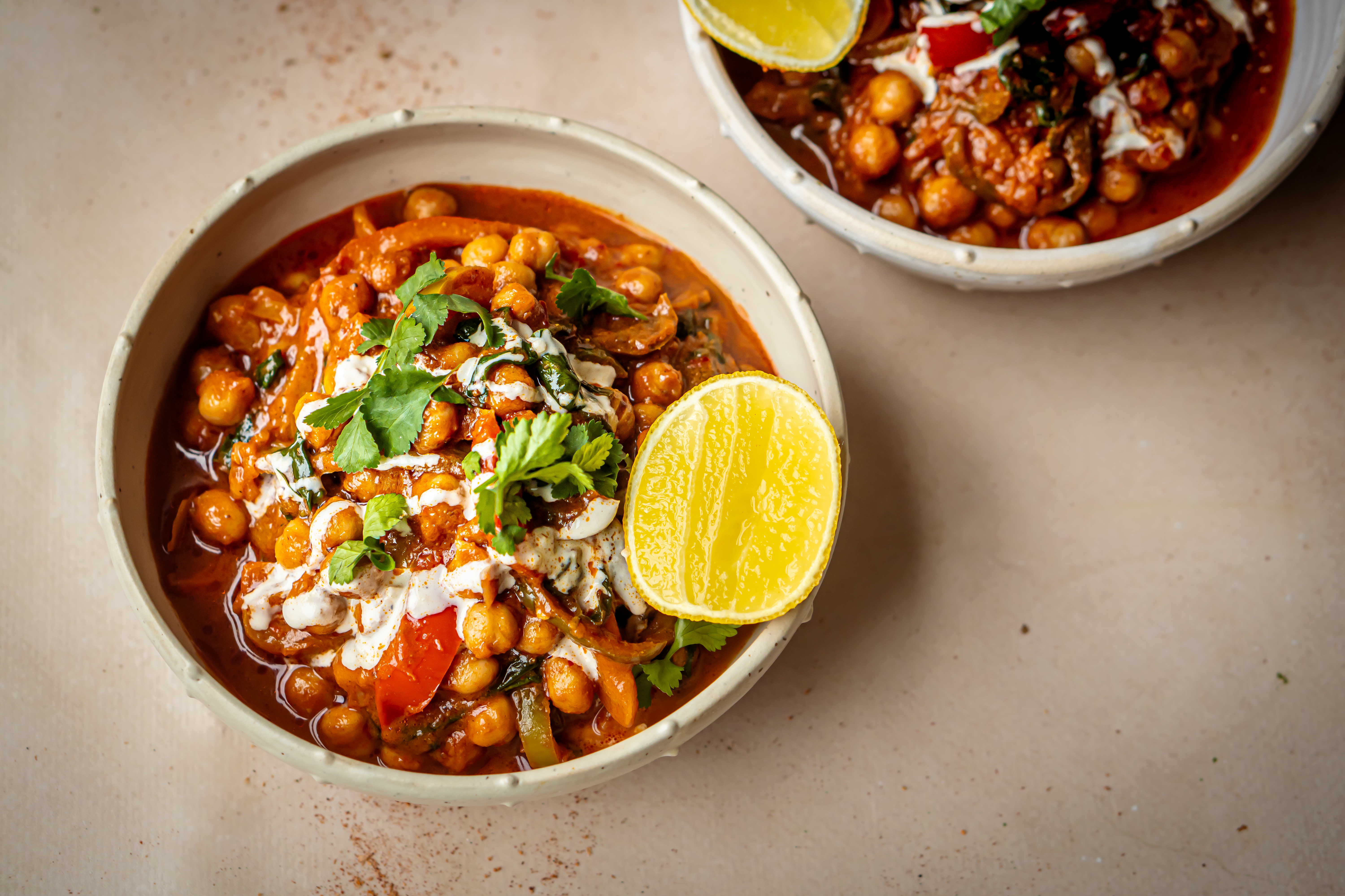 > Naar het recept: kikkererwtenstoof met paprika, harissa en een tahin-citroendressing