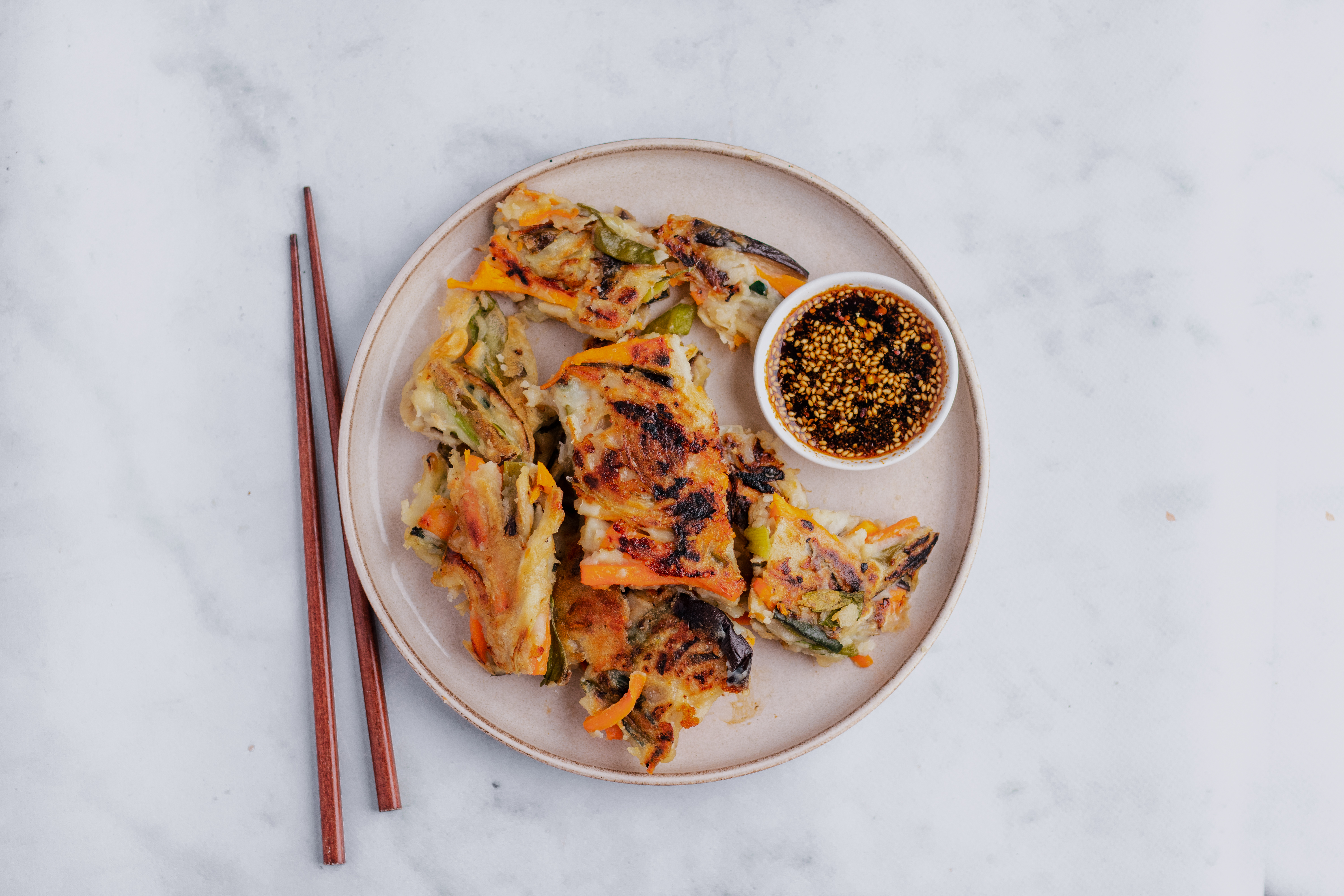 > Naar het recept: Koreaanse pannenkoek: snelle groentepannenkoek met dipsaus