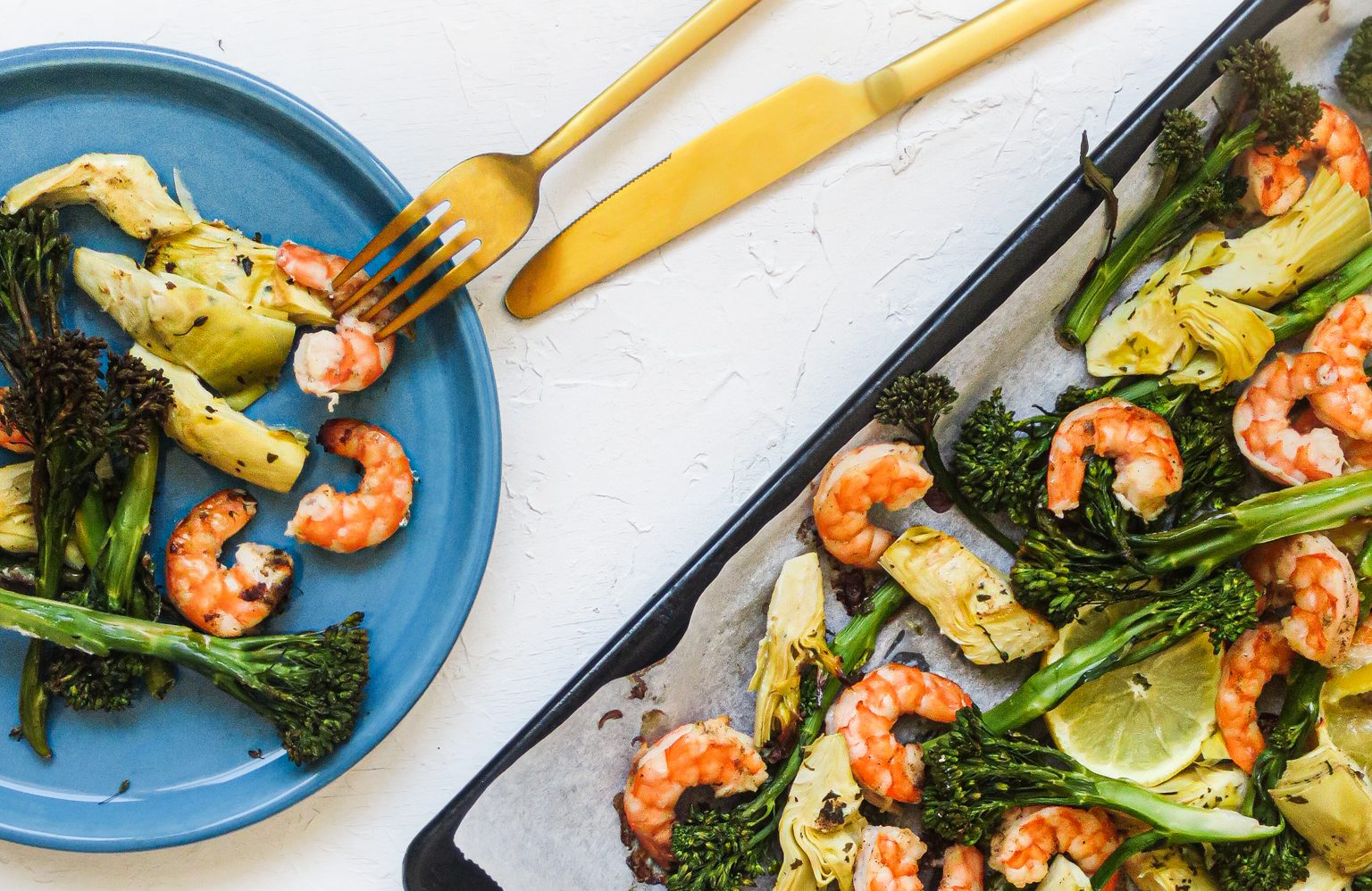 > Naar het recept: gamba’s met bimi, artisjok en citroen van de bakplaat