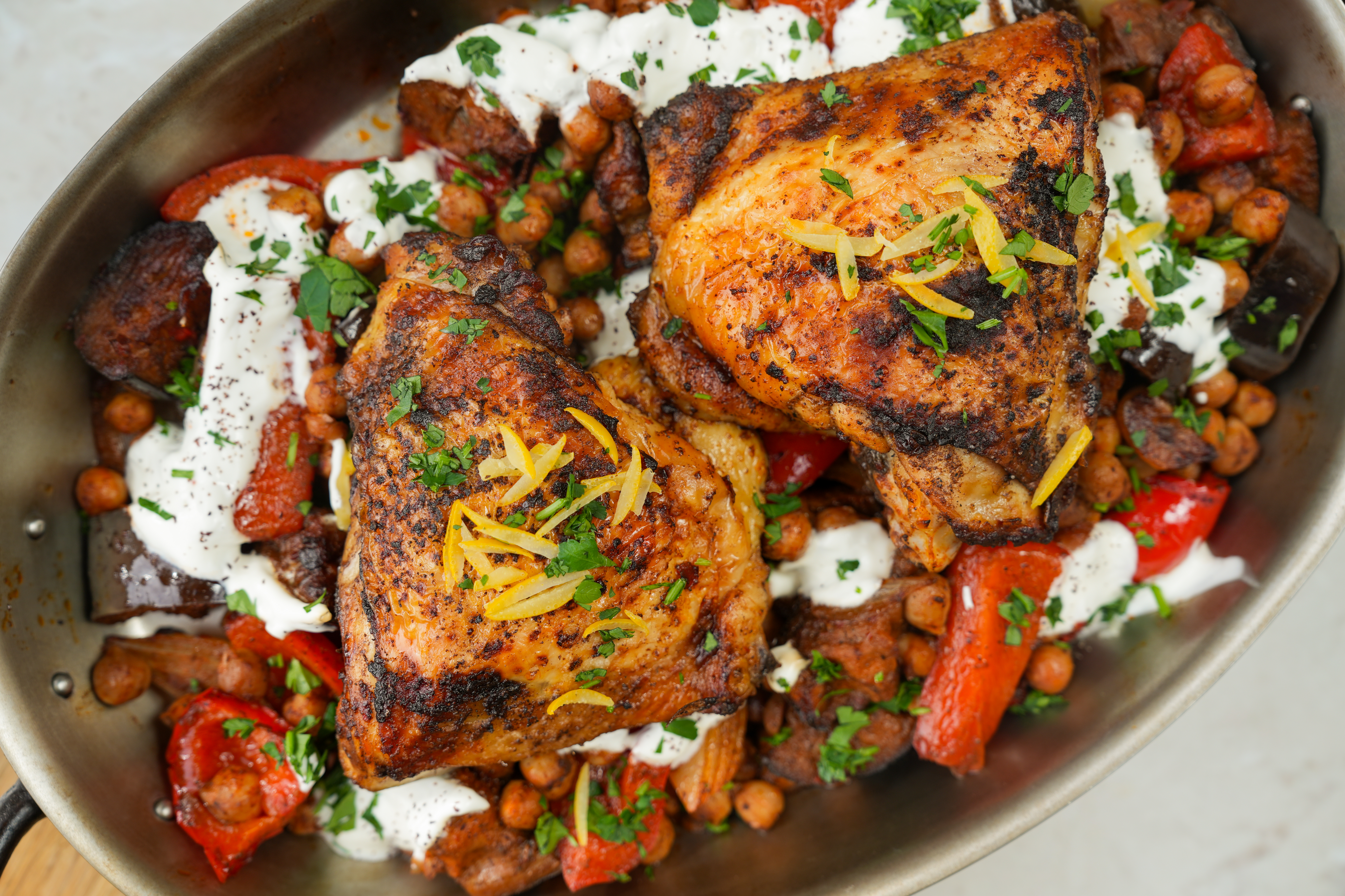 > Naar het recept: traybayke met kippendij, ingelegde citroen en kikkererwten