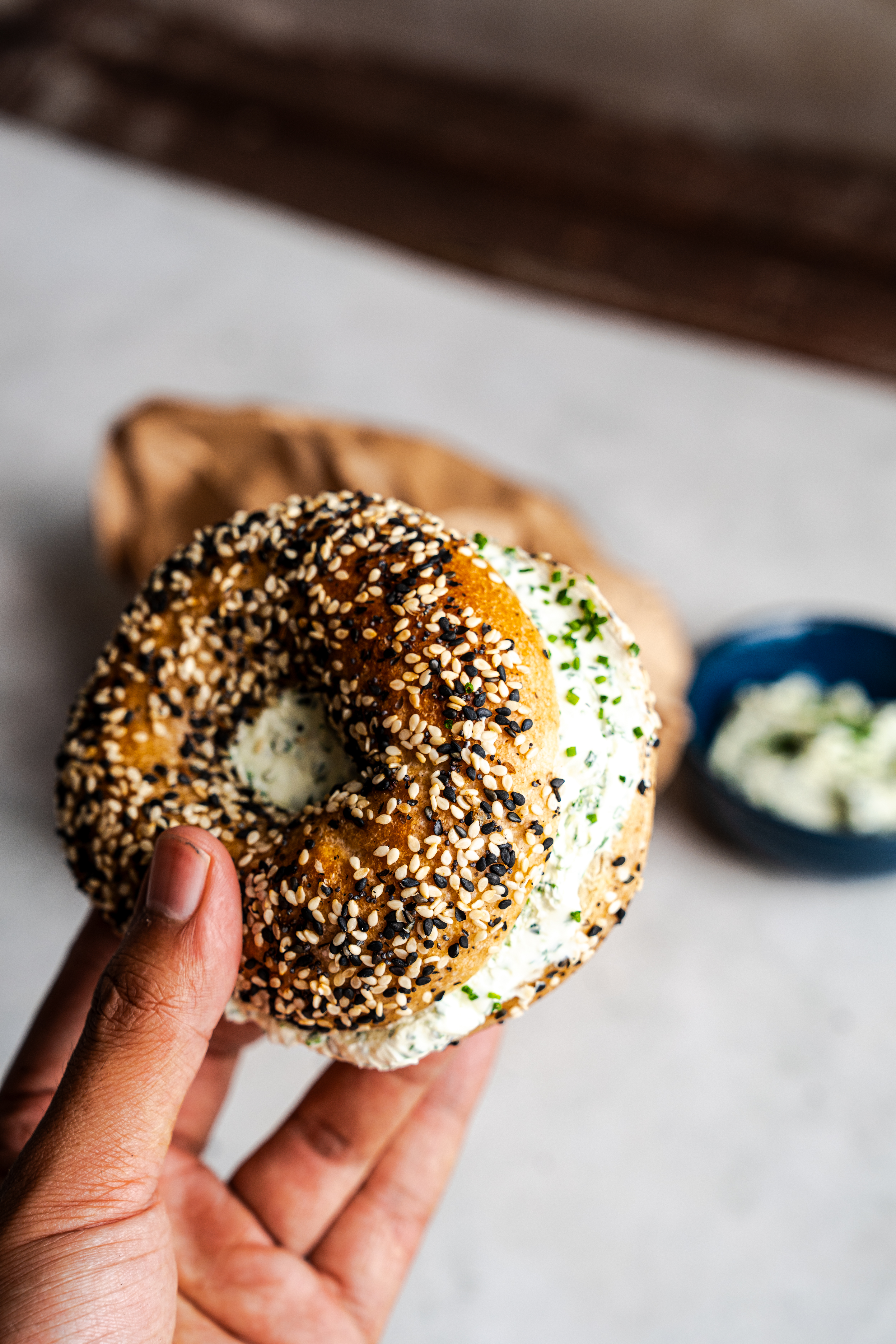7. Everything bagel met opgeklopte roomkaas met bosui (zoals in een deli in NY)