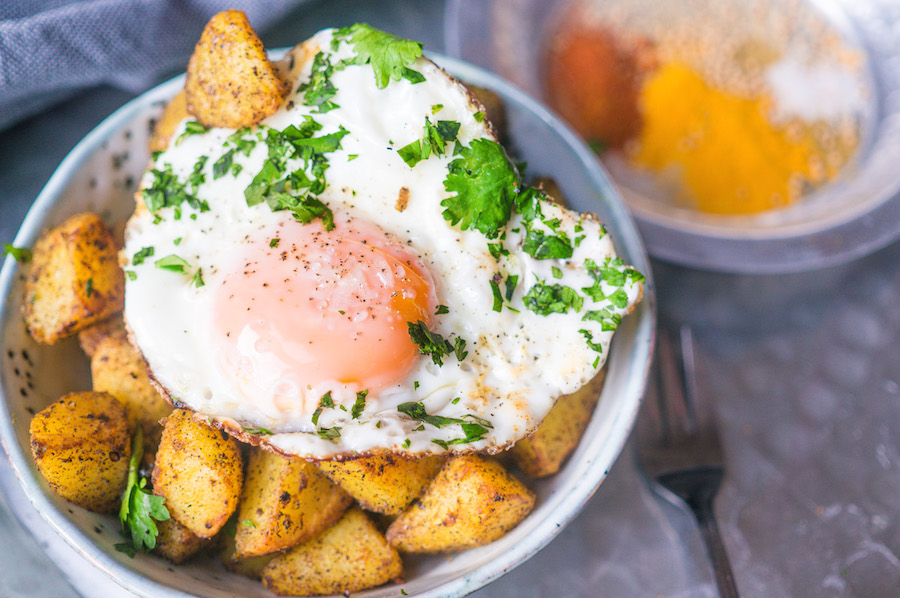 Naar recept:Â Indiase Bombay aardappeltjes met gebakken ei