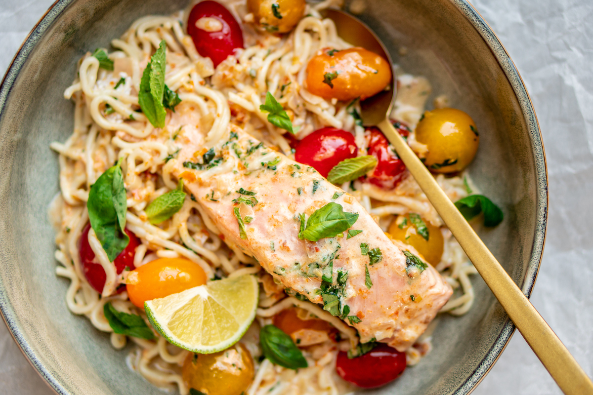 Dit heerlijke makkelijke eenpansgerecht is één van onze favoriete recepten om lekker snel op tafel te zetten. Heerlijk met kokosmelk, kerstomaten en noedels.