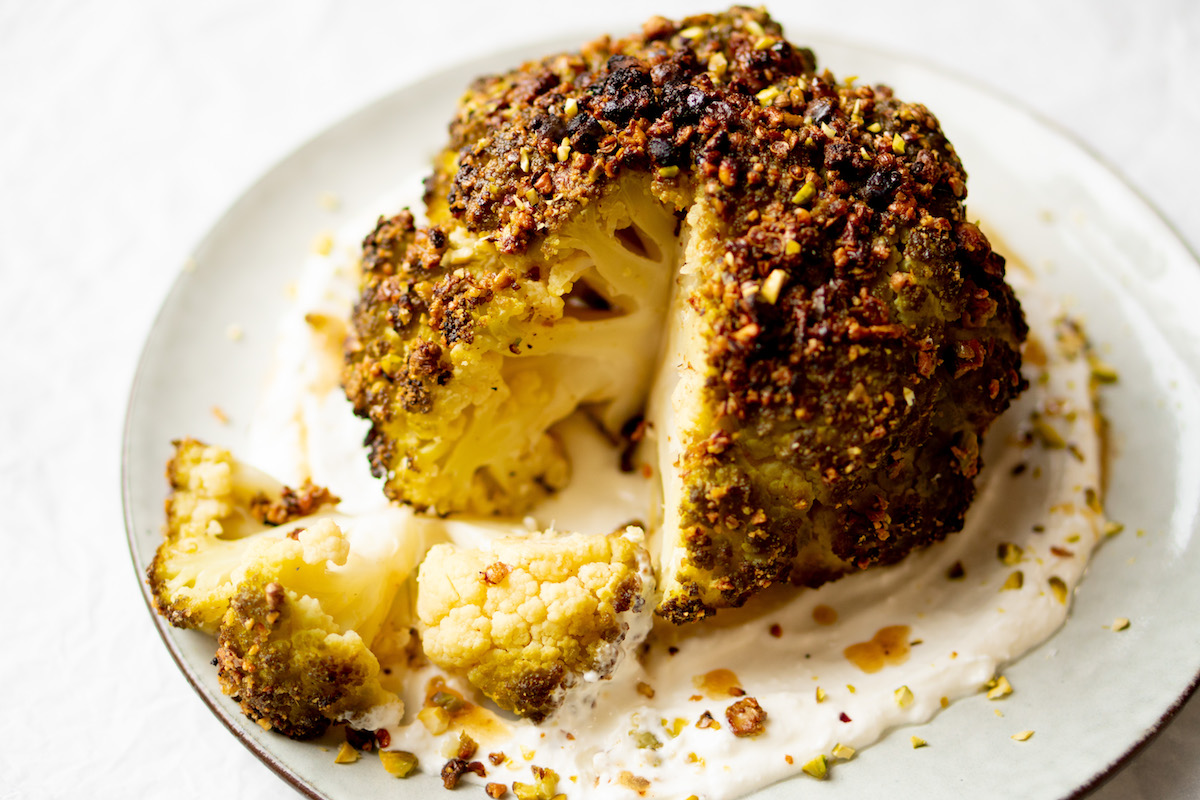 Naar recept:Â Hele geroosterde romanesco met beurre noisette en pistache
