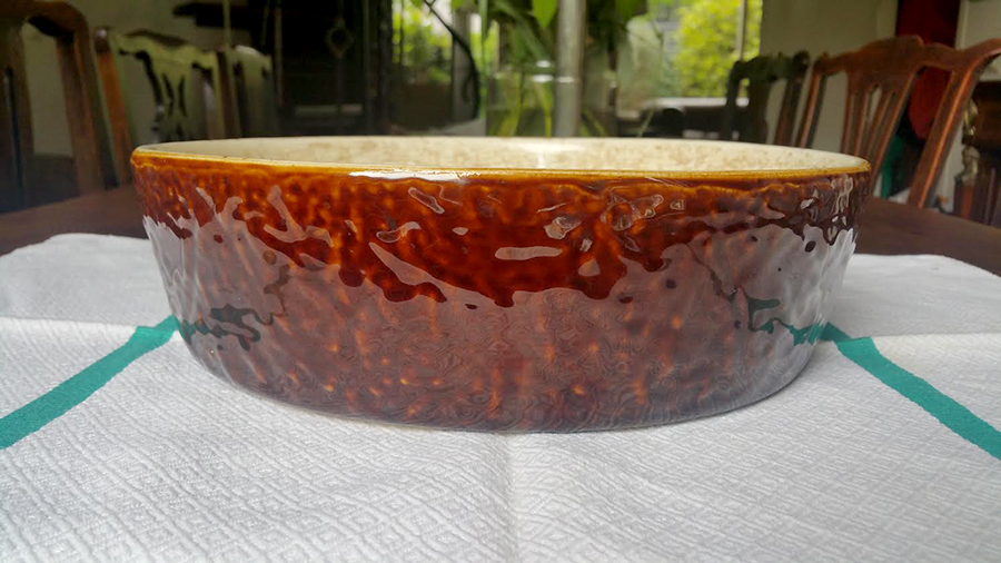 Dit is mam’s souffléschaal. Ik heb hem nog steeds en kan hem niet wegdoen. Ze kreeg de ovenschaal bij haar trouwen en eigenlijk met zijn doorsnede van 28 centimeter is hij veel te groot om soufflés in te maken…”