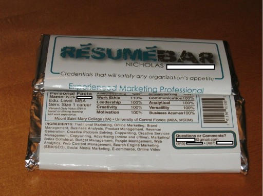 Een classic verhaal: de Amerikaanse Nick zocht een nieuwe baan in de marketing branche. Niet makkelijk momenteel. Toch wist deze creatieve marketeer-in-de-dop zijn kop boven het maaiveld uit te steken: hij maakte zijn CV op een chocoladereep. Zijn beste ingrediënten? Creativiteit, motivatie, work ethic en leiderschap.