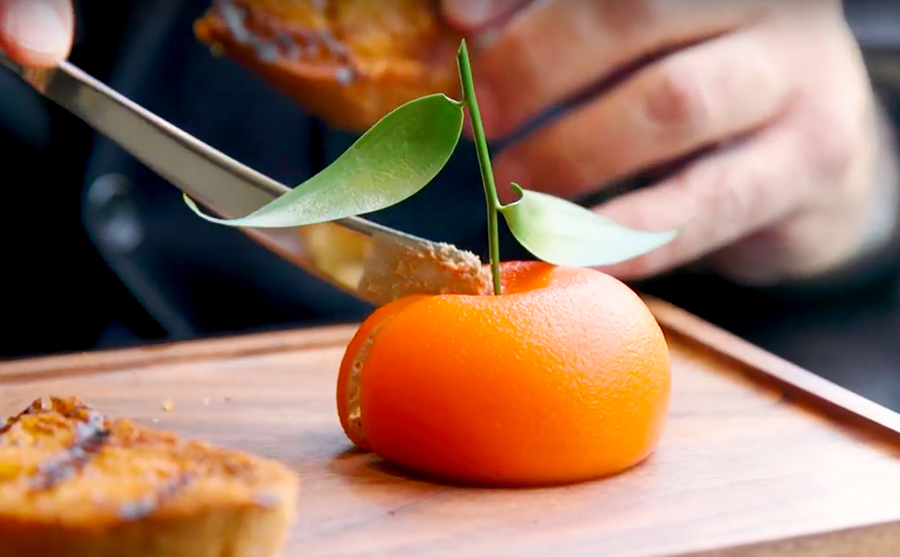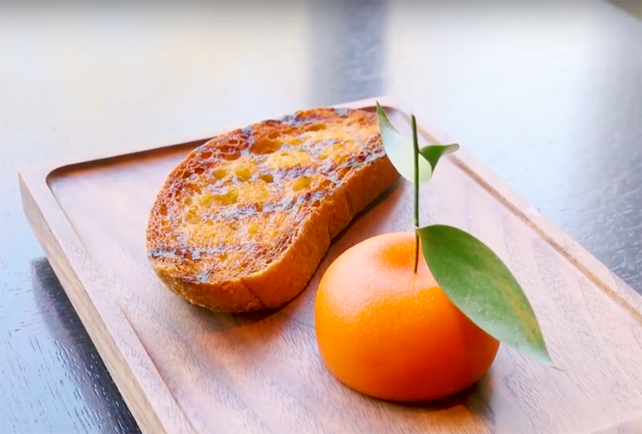 Da’s niet alleen lekker: het gerecht is ook een lust voor het oog. Het wordt op een plankje voor je neus gezet: meat fruit dat een sprekende gelijkenis vertoond met een echt mandarijntje, geflankeerd door een stuk toast.