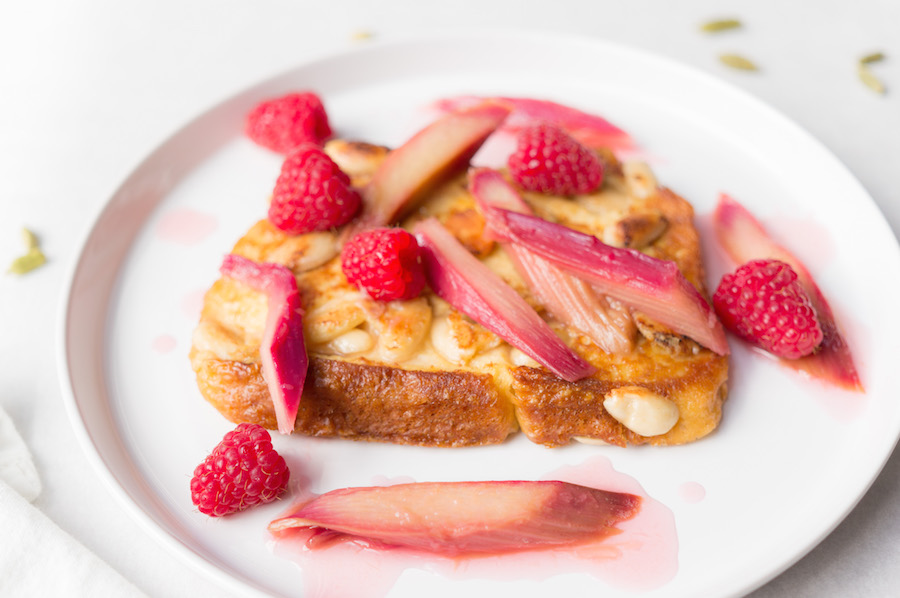 Wentelteefjes met rabarber, gemaakt van dikke plakken brioche, geweekt in kokosmelk met kardemom, gebakken met een jasje van knapperige amandelen.