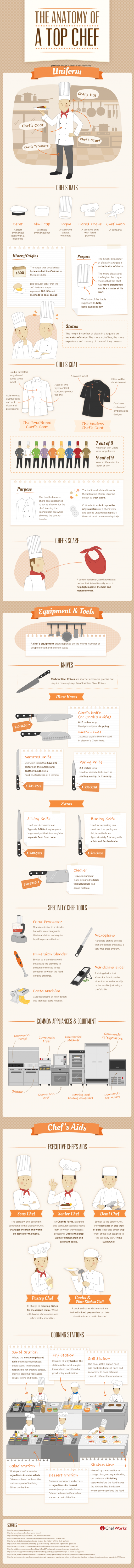 In deze toffe infographic leren we alles over de anatomie van topchefs. Tuurlijk, ze hebben armen en benen – net als ‘gewone’ mensen. Maar wat doet die toque op hun hoofd en waar dient het kekke sjaaltje voor?