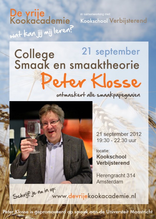Donderdag 21 september start een nieuw seizoen interessante workshops met een college smaak en smaaktheorie, gegeven door Peter Klosse. Peter heeft onder andere stage gelopen bij Robert Kranenborg in Brussel en is aan de Universiteit van Maastricht gepromoveerd op smaak, een genie op zijn vakgebied.