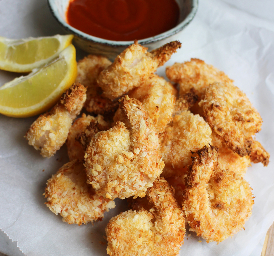 Last but not least… Een toevoeging van één van de grootste favorieten onder de schaaldieren: gamba’s. Deze zijn heerlijk crunchy met een kokosjasje. En ze zijn lekker makkelijk te maken én minder vet doordat je ze in de oven bakt (geen frituurpan nodig dus!).
