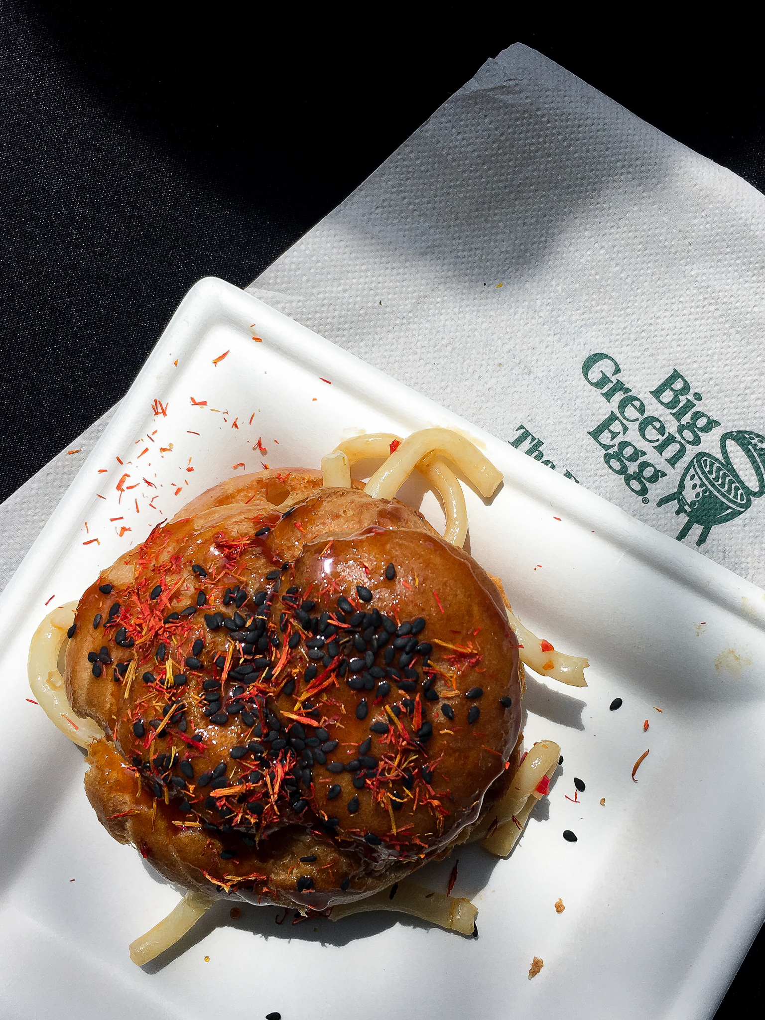 De genieën achter deze snack bleken de mannen van BBQ Friday te zijn: een barbecue cateringbedrijf uit Lisse. Om een publiek te bedienen waarbij vlees zo hoog in het vaandel staat, vinden we deze noodlesoes toch wel een erg dapper gerecht. Hoewel het gerecht niet helemaal vegetarisch is (de soes was namelijk gevuld met brisketcrème) ligt de nadruk toch echt wel op de soes en niet op het vlees. Dat is heel wat anders dan de klassieke lamskoteletten die we gewend zijn.