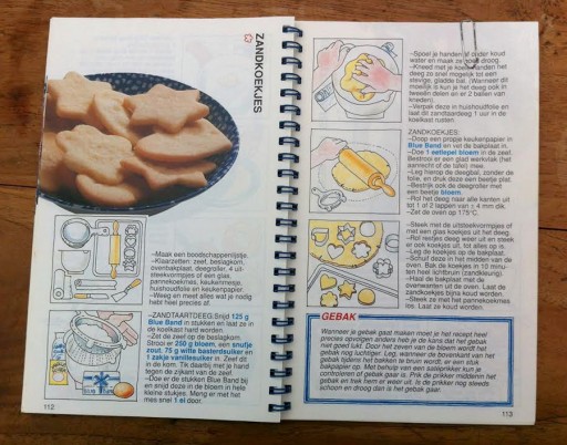Culy’s Monique gaat maar meteen met de billen bloot. “Mijn eerste baksels waren, heel origineel, zandkoekjes. Naar een recept uit het Blue Band Kinderkookboek uit 1993, die we destijds nog ‘bleu band’ noemden. Het was mijn bijbel, mijn persoonlijke kookboekje, mét zo’n kekke ringband.