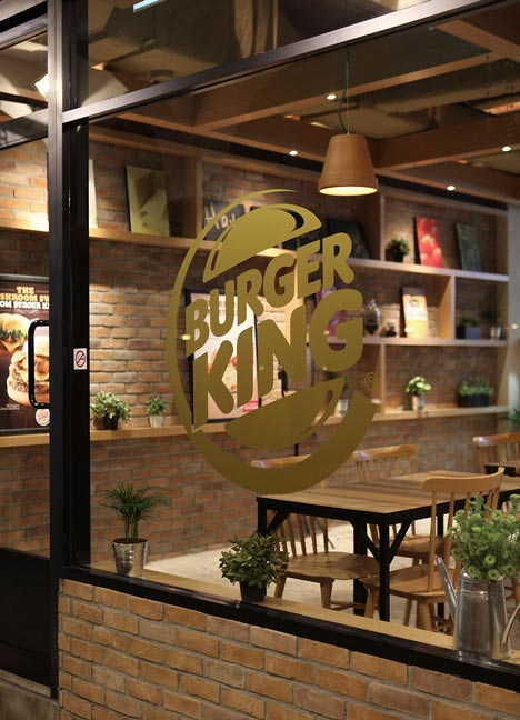 Design collectief Outofstock werd gevraagd de Burger King te restylen in de stijl van een Engelse tuin. We zien dan ook bakstenen muren, lampen in de vorm van plantenpotten, brede banken en half metaal, half houten eettafeltjes, geinspireerd door campingmeubels. Op houten planken aan de muur staan ingelijste foodposters.