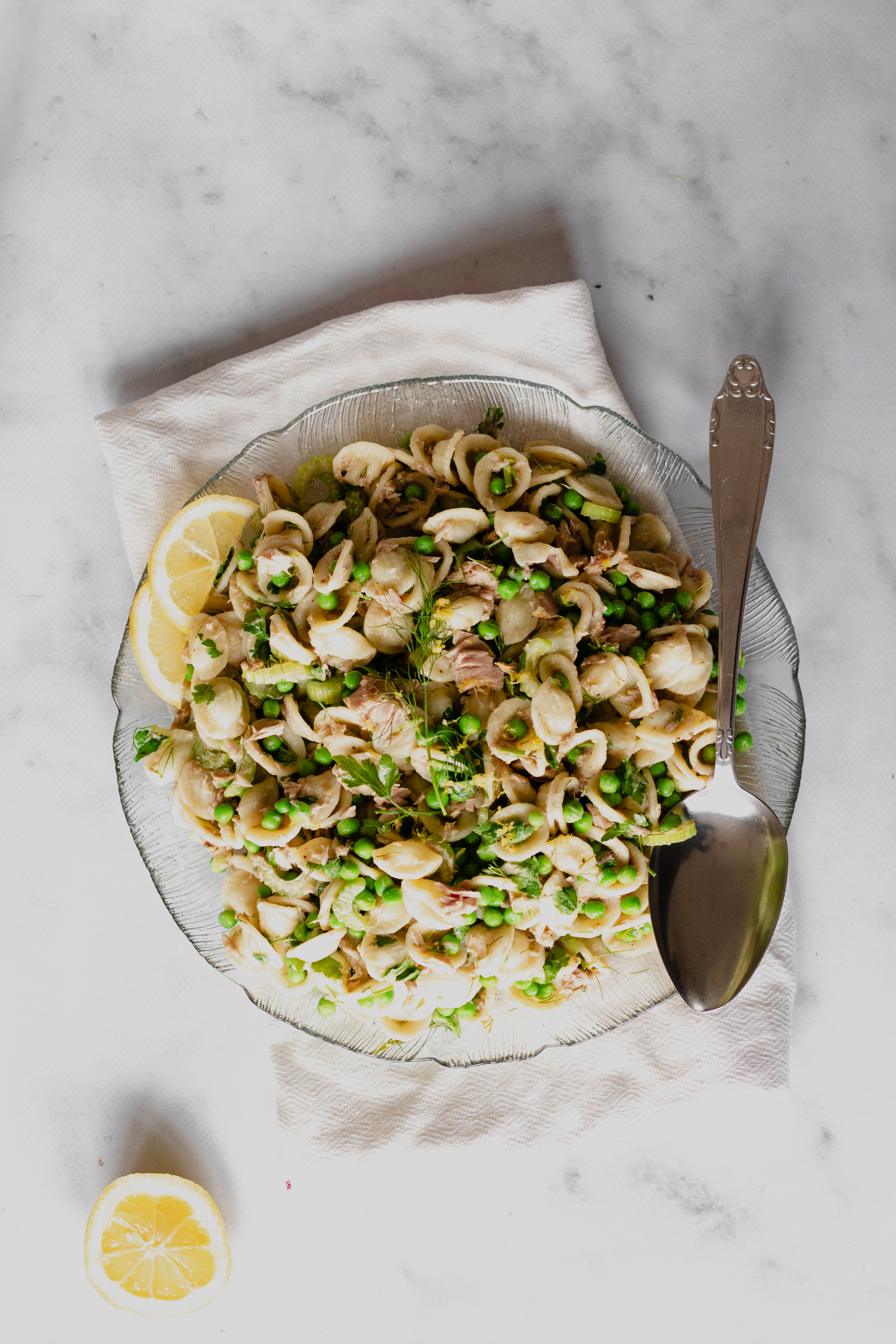 Waarschijnlijk heb je ergens achterin de vriezer nog een verloren zak met doperwten liggen. Die mag je nu tevoorschijn halen, want in deze (koude) pastasalade zijn ze heerlijk. En soms heb je gewoon een gerecht nodig dat zowel lekker als snel te maken is.
