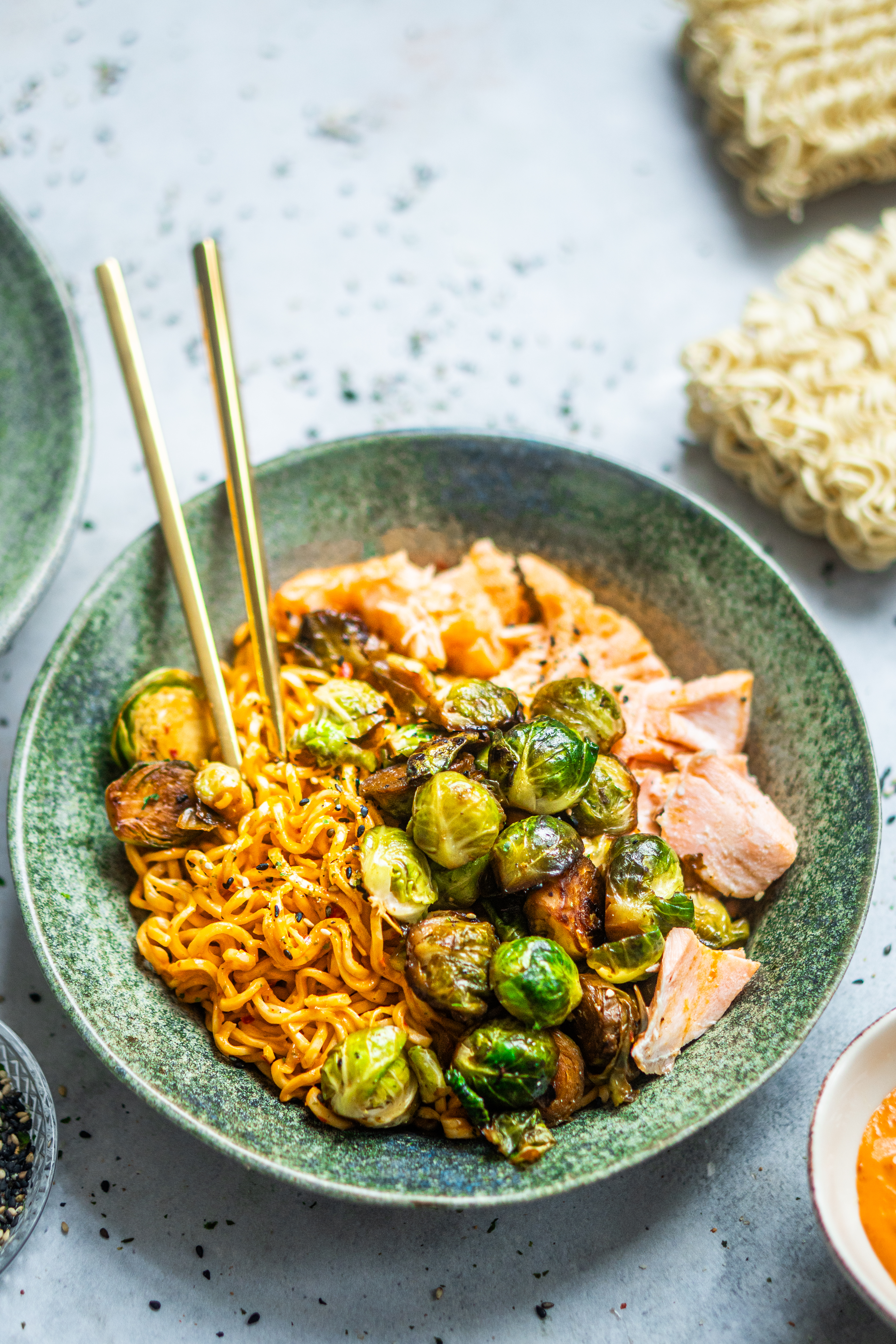 Deze noodles met zalm, ketjapspruitjes en sambal zijn per toeval ontstaan als gevalletje #cleaningupthefridge en sindsdien zijn ze een blijver in ons repertoire. Want: een romig sambalsausje, malse zalm en gekaramelliseerde ketjapspruitjes? Da’s gewoon lékker.