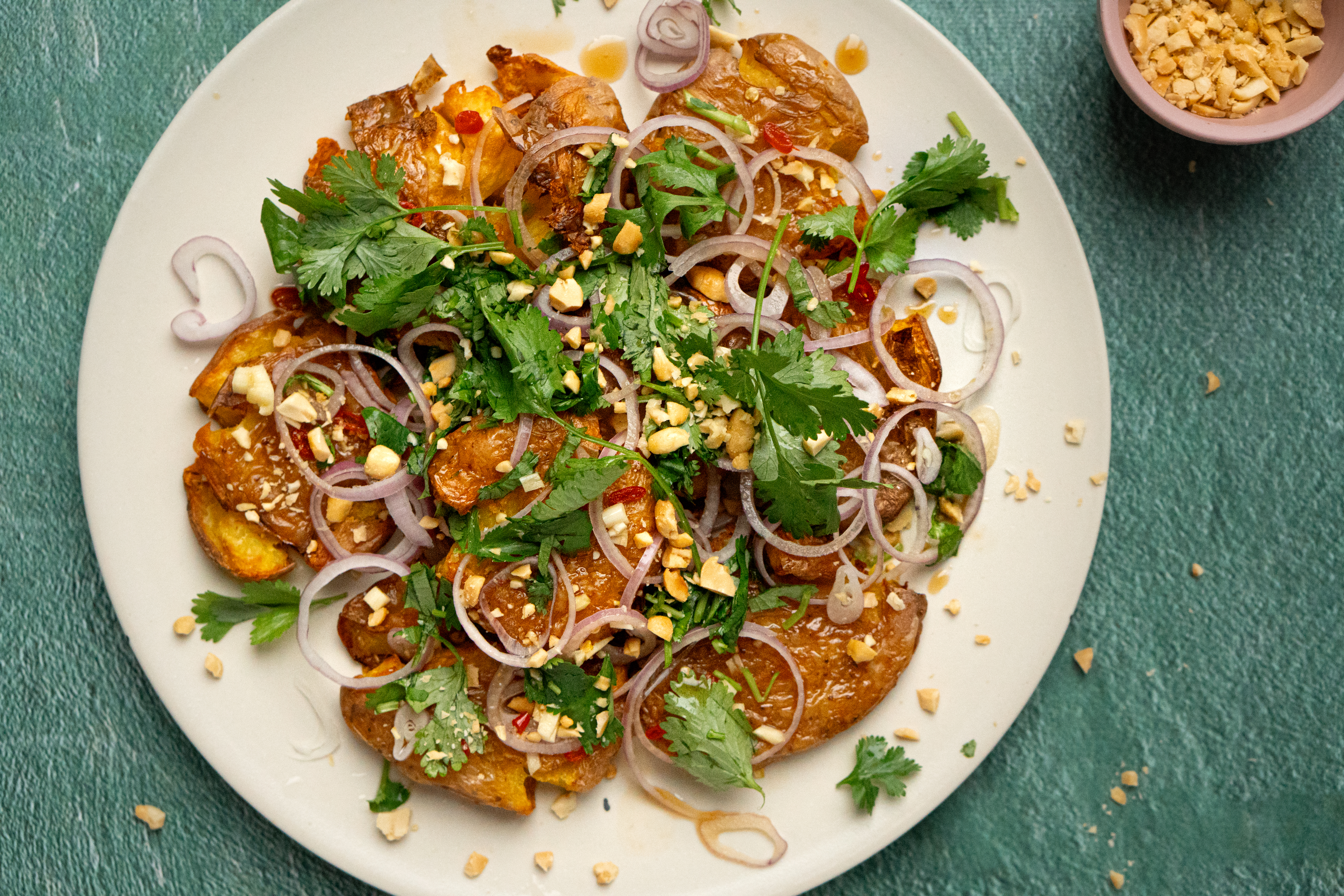 > Naar het recept: smashed potatoes met Thaise dressing, koriander en pinda’s