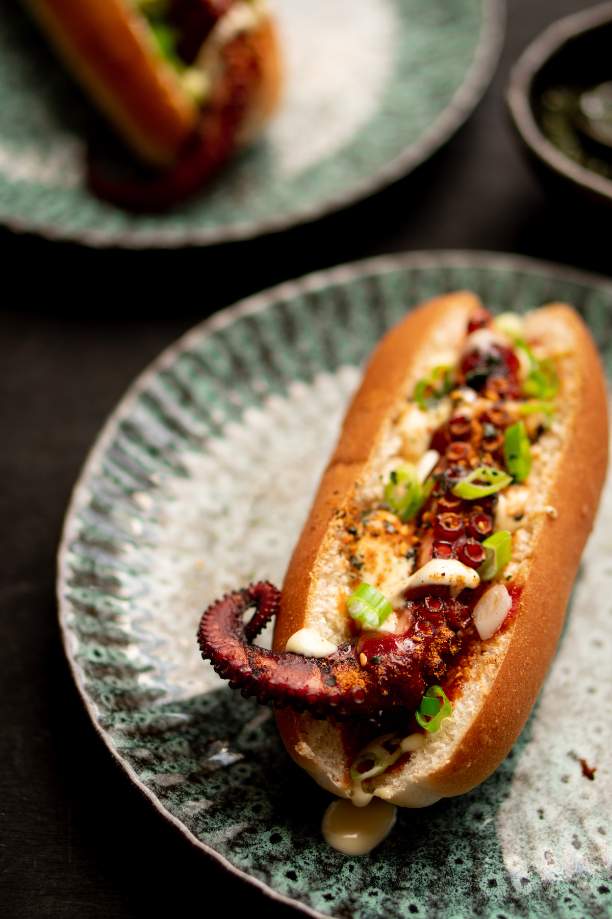 Deze octodog – een kruising tussen een hotdog en een octopus, snap je ‘m? – is geïnspireerd op twee van onze favoriete snacks. Enerzijds de hotdog, anderzijds takoyaki. Die ken je als die Japanse poffertjes met een vulling van octopus en lekkere toppings als okonomiyakisaus, Japanse mayonaise en bosui.