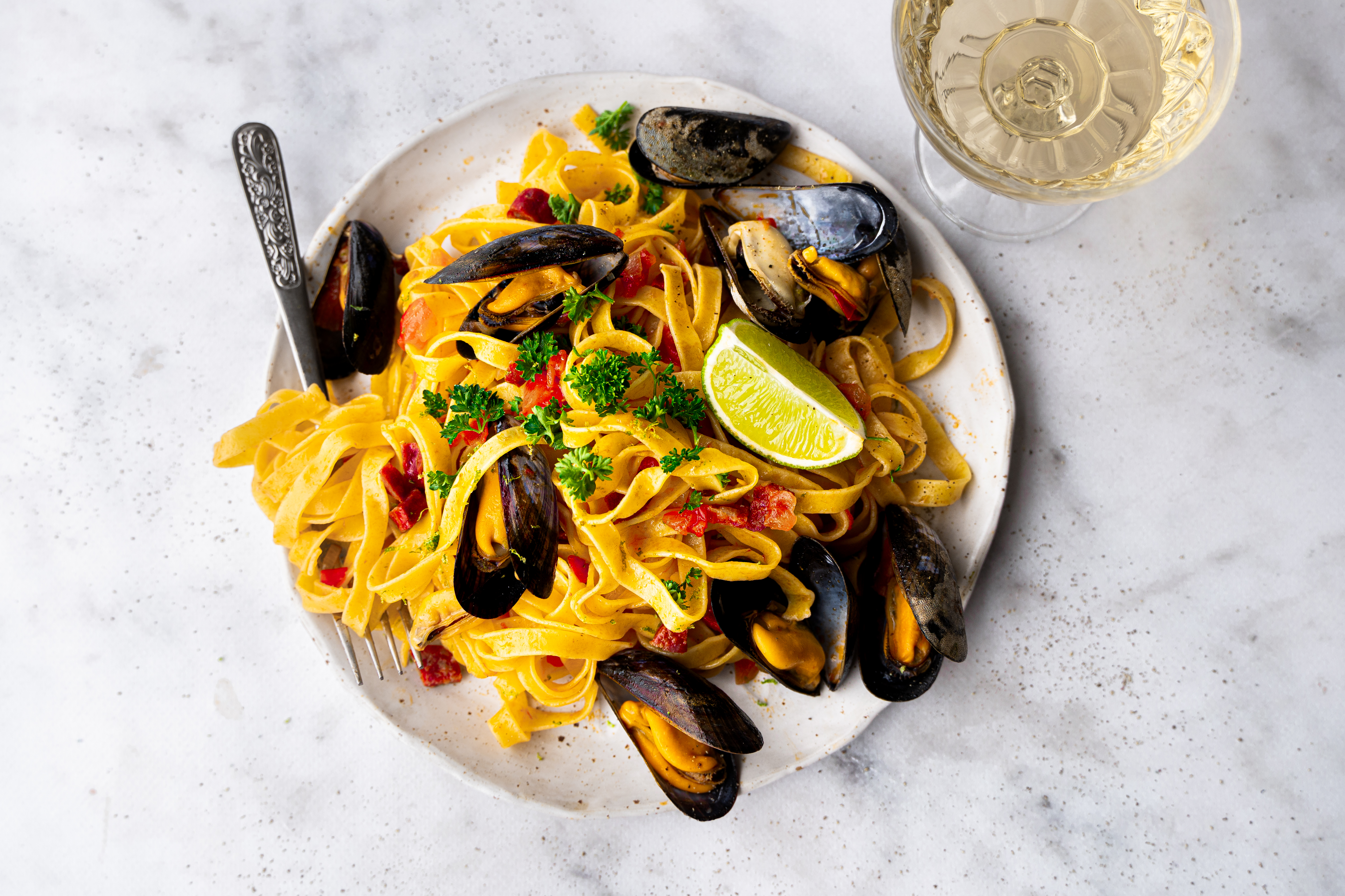 > Naar het recept: tagliatelle met mosselen, chorizo en limoen