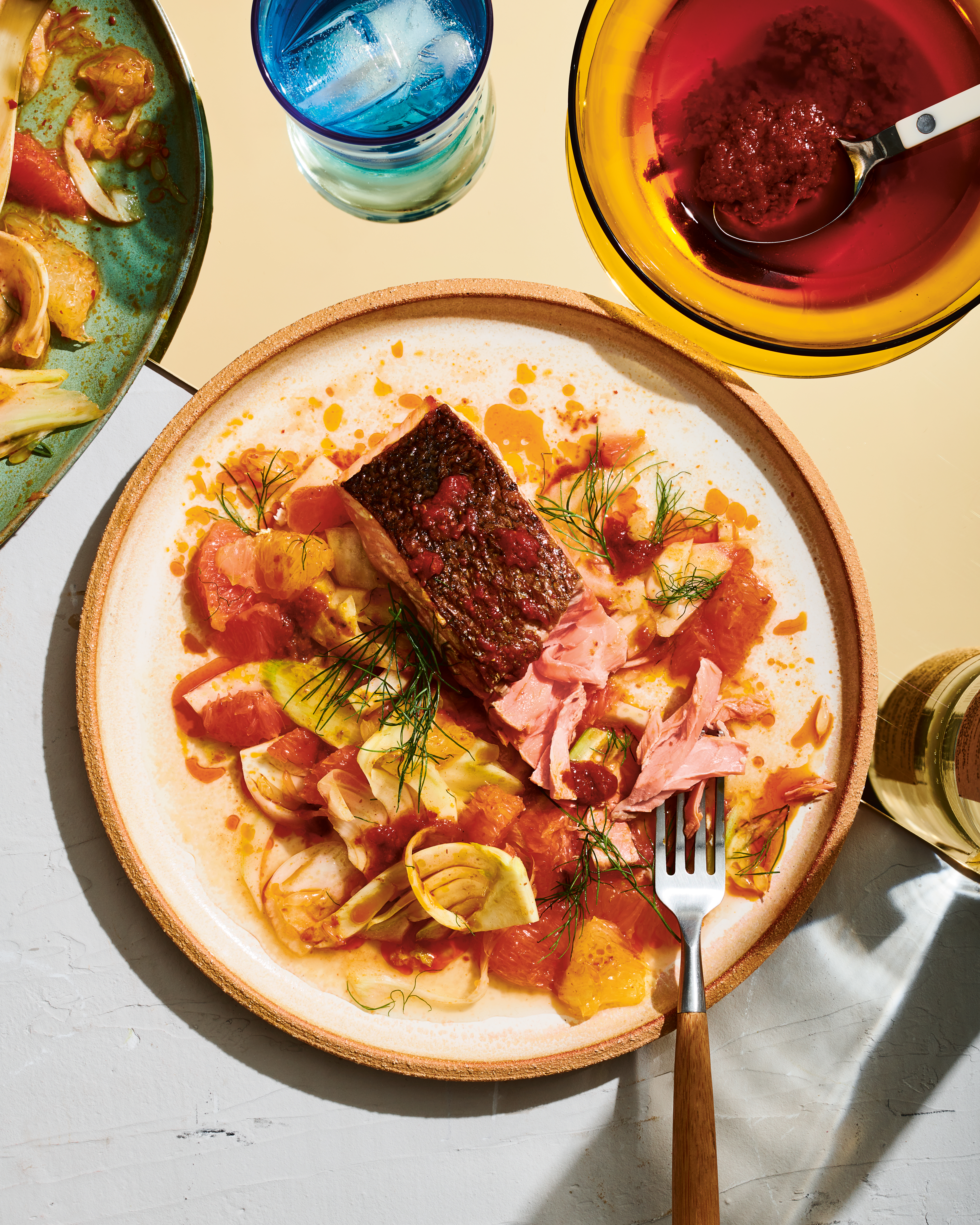 > Naar het recept: zalm met krokante korst, geserveerd met een salade van citrusfruit, venkel & harissa