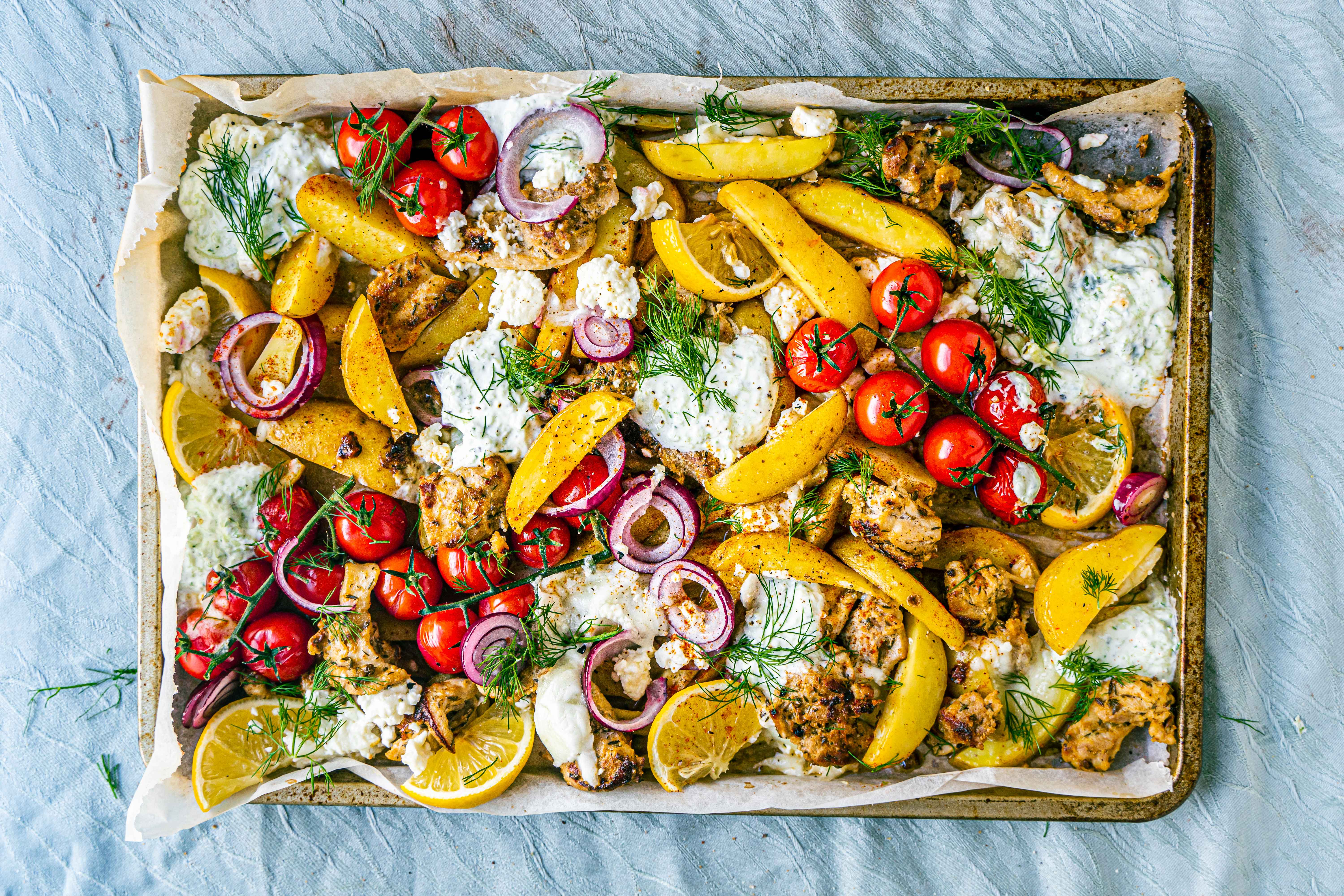 Een Grieks geïnspireerd gerecht waarbij malse kip, groenten, kruiden en frietjes samen op een bakplaat worden geroosterd. Ideaal voor een doordeweekse avond.
