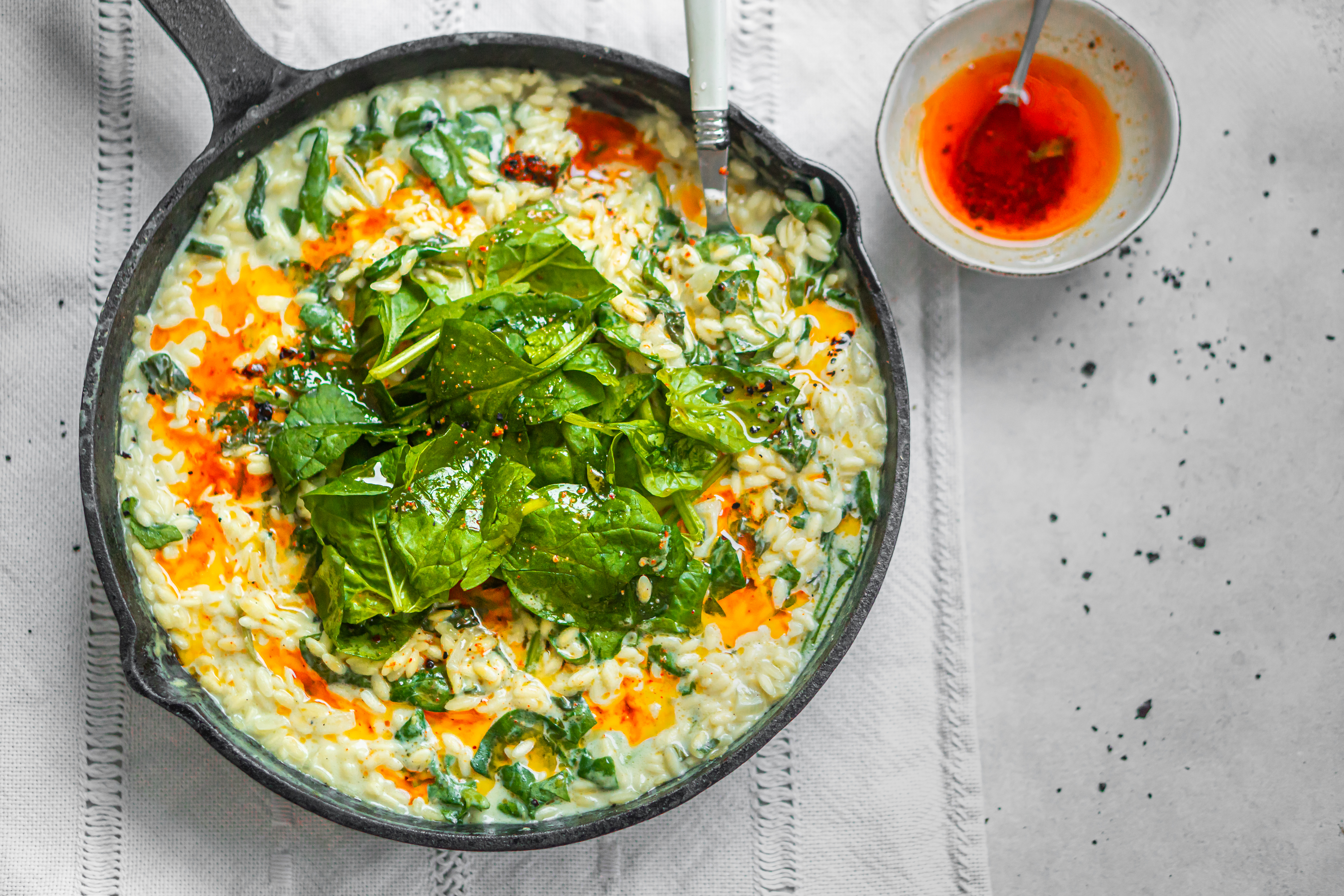 > Naar het recept: orzo met spinazie, parmezaan en chiliboter