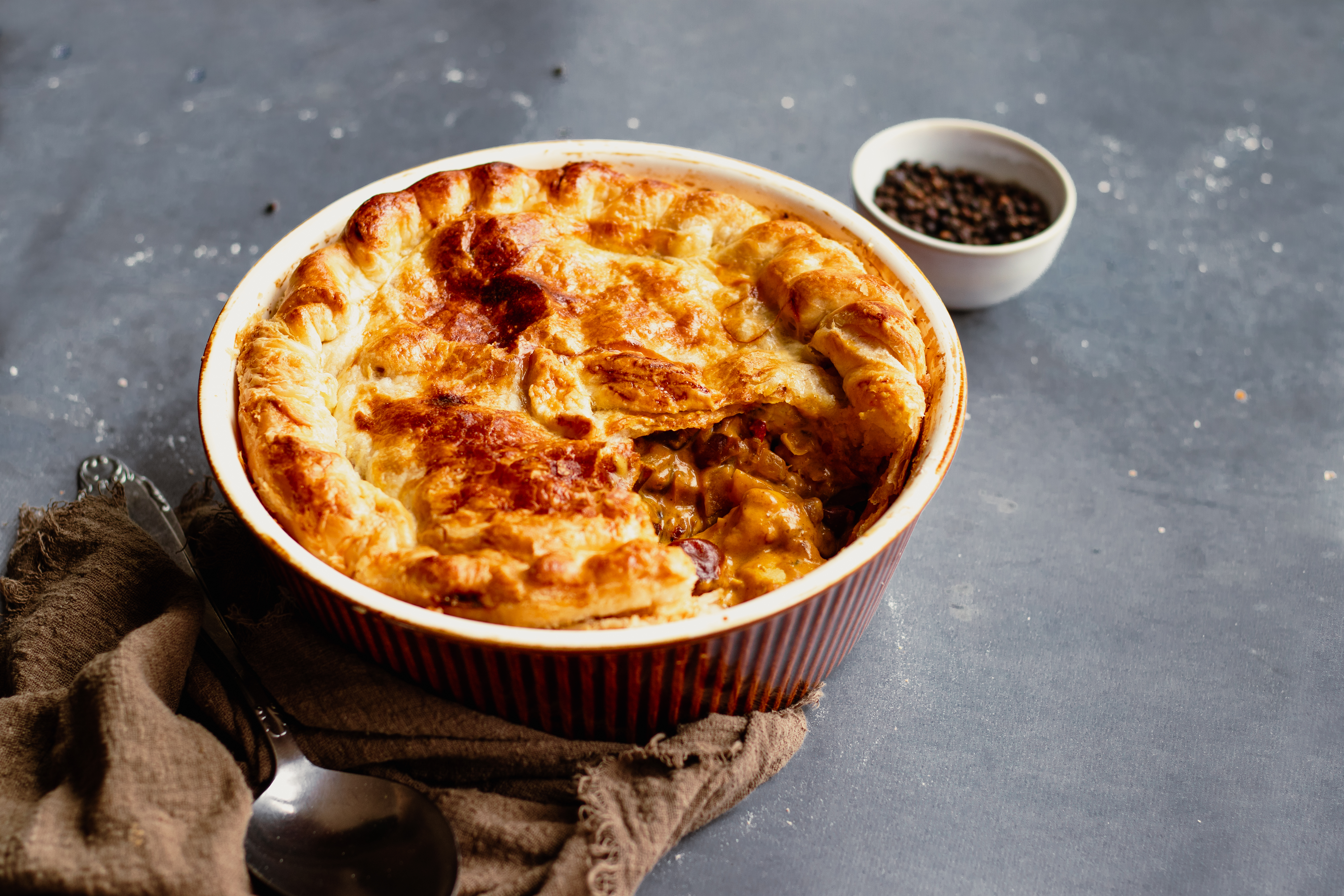 > Naar het recept: kip in de hoed: een hartige taart met kipkerrie en kersen