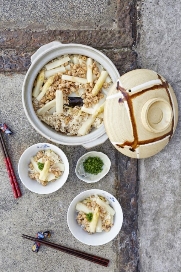 > Naar het recept: takikomi gohan (rijst met asperges en garnalen) uit ‘Hokkai’
