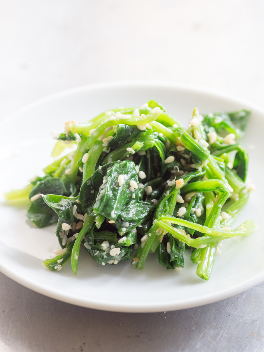 De spinazie wordt kort geblancheerd en het vocht wordt eruit geknepen. Daarna gaat er goma-ae overheen: een lekkere sesamdressing.