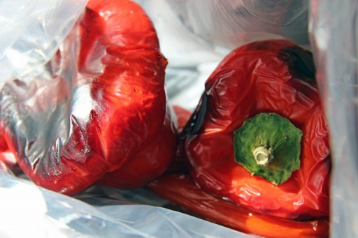 De truc zit ‘m in het meteen luchtdicht afsluiten van de paprika’s. Dit kan in een kom met een vel vershoudfolie eroverheen, of in bijvoorbeeld een druk-en-sluit zakje.
