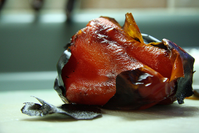Na een paar minuutjes worden de eerste zwarte blaren zichtbaar, en zul je de paprika(‘s) moeten omdraaien. Doe dit regelmatig tot hij helemaal (of zo goed als) zwart ziet. Pas overigens wel op dat ze niet zo hevig verbranden dat het velletje grijs wordt. Dit trekt namelijk door in de paprika en is allesbehalve bevorderlijk voor de smaak.