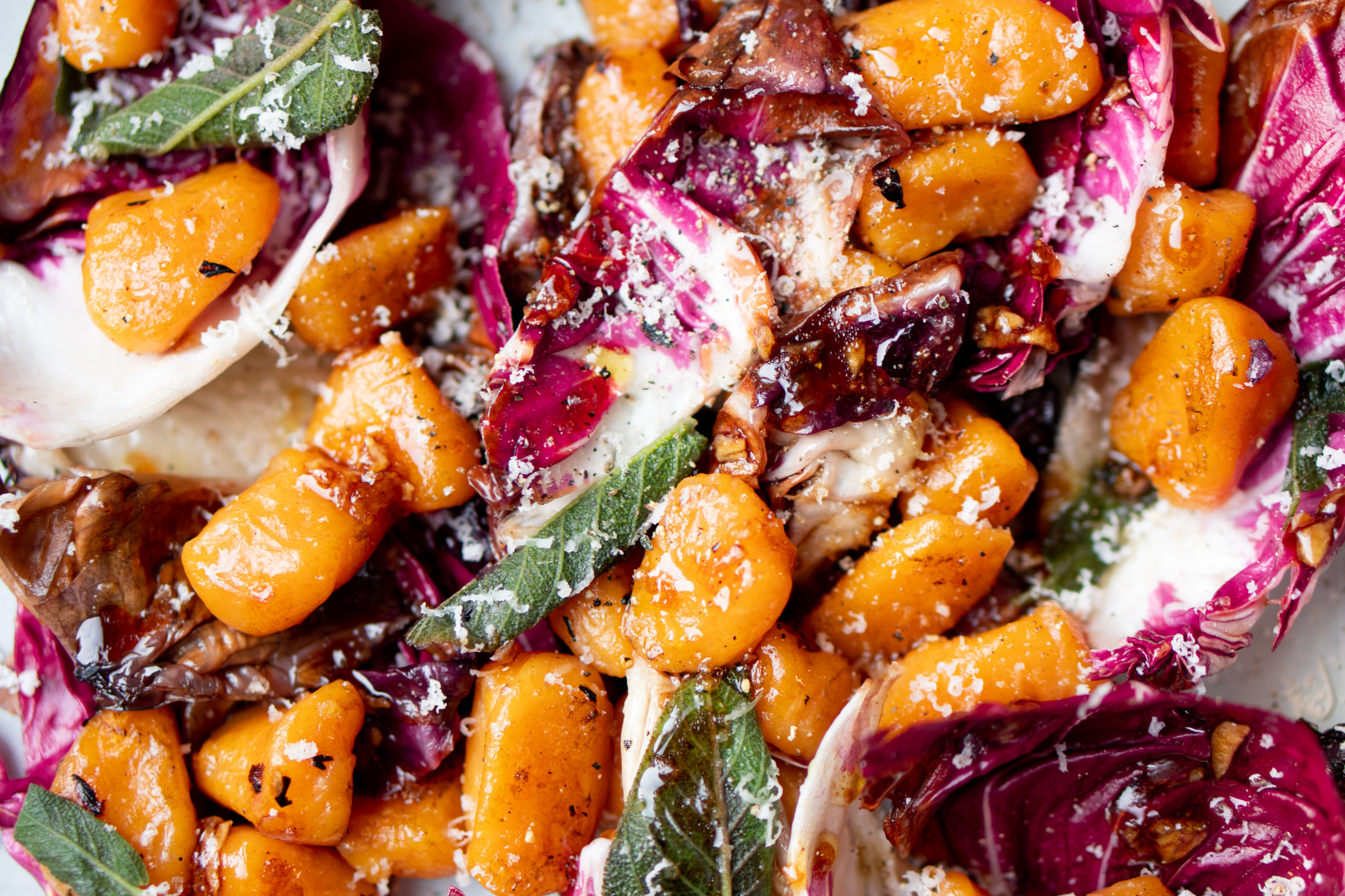 > Onze favoriete gerechten met gnocchi: Gnocchi met worst, hazelnoot, spinazie en rozemarijn of zelfgemaakte zoete aardappel gnocchi met radicchio