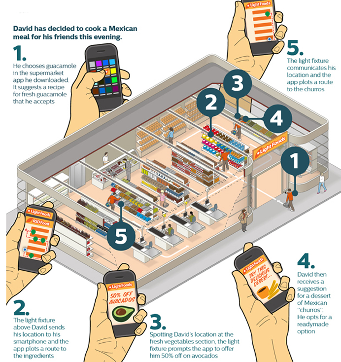 Wij besluiten dat we tiramisu willen maken en geven dat aan op de app. De app oppert vervolgens een recept dat wij accepteren. Je gaat naar de supermarkt, en de app maakt verbinding met de speciale ledlampen, die aangeven waar wij ons in de winkel bevinden. Aan de hand daarvan berekent de app de snelste route naar de ingrediënten die nodig zijn voor de tiramisu. Zodra we bijvoorbeeld bij de zuivelafdeling zijn, geeft de app ons door dat de mascarpone van een bepaald merk in de aanbieding is. De app heeft inmiddels door dat we een Italiaans gerecht willen maken en maakt ook de suggestie of we misschien niet een pizza willen kopen. We kunnen dan kiezen voor de ingrediënten om een pizza te maken of voor de kant-en-klare variant. Opnieuw wordt er verbinding gemaakt met de speciale ledlampen en stuurt de app ons pizza’s in de supermarkt.