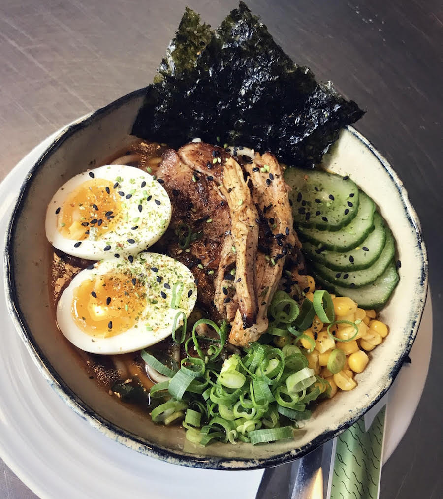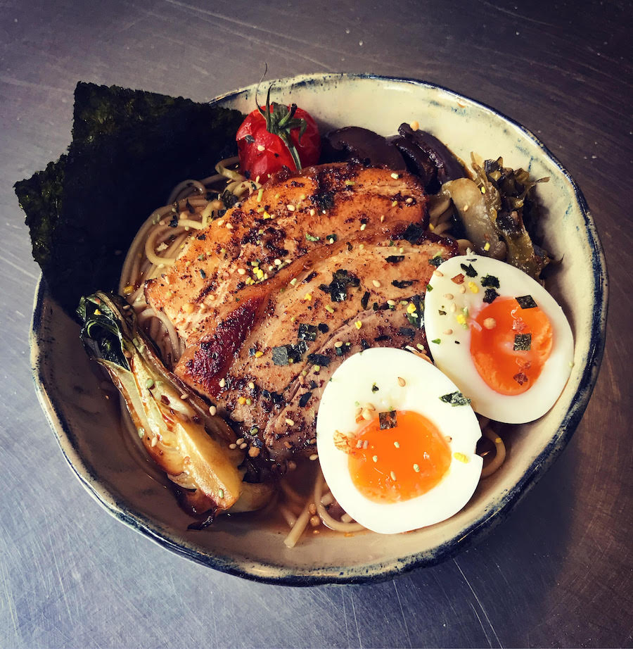 Denk aan een mix van tonkotsu en shio (sojasaus) kip ramen. Chashu met een glazuur van appelstroop erop, een zachtgegaard soja-ei en kippenvet met Madame Jeanette.
