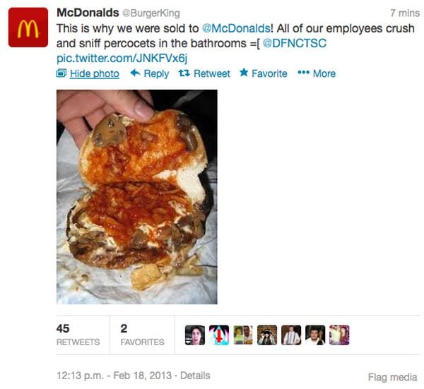 De digitale inbrekers veranderden de Twitter-avatar van Burger King naar het McDo logo en pasten de bio aan: “Just got sold to McDonalds because the whopper flopped” (‘We zijn net verkocht aan McDonald’s omdat de Whopper is geflopt’). Daarna volgden vele lullige tweets. Pijnlijk….