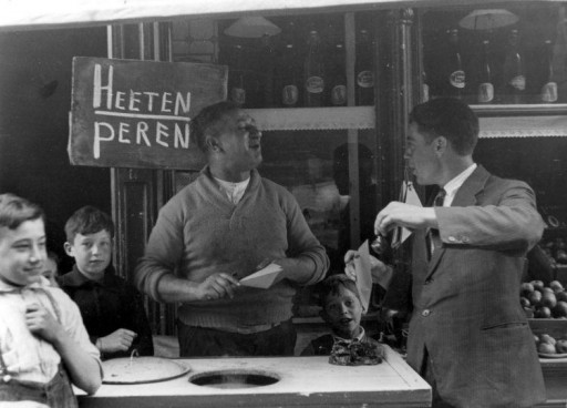 Straatverkoper van peren, Amsterdam, 1934. Bijschrift: “hoeveel peeren wenscht mijnheer?”