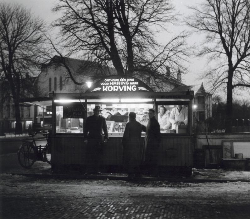 Haringstalletje (viskraam) van Korving op het Frans Halsplein te Haarlem bij avond, Nederland, 2 januari 1953.