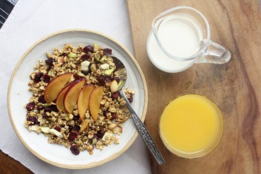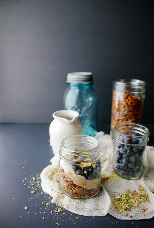 Pistacheparfait met blauwe bessen, quinoa granola en cashewnoten-crème met ahornsiroop