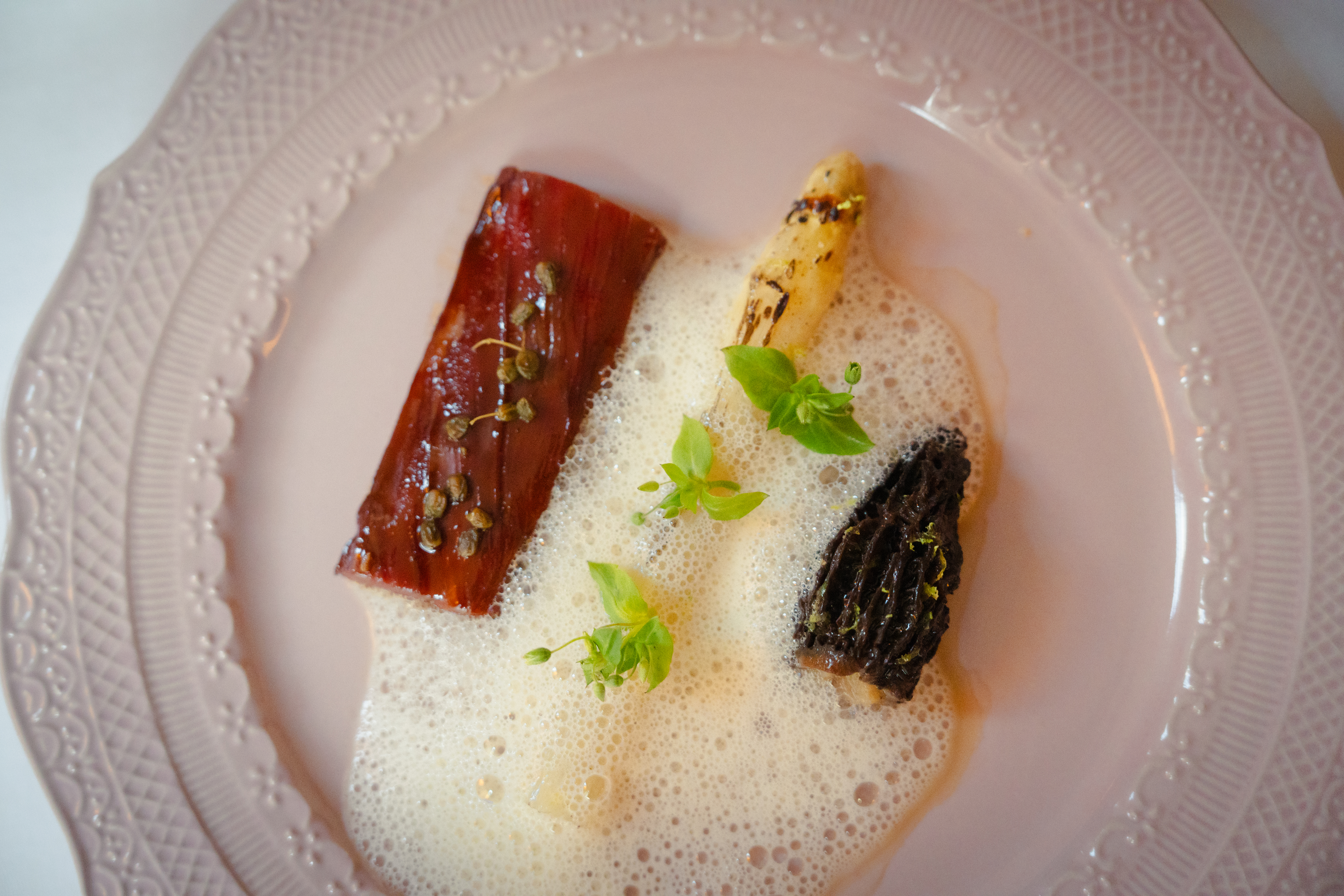 Dan volgt een klassiek seizoensduo: witte asperge en cantharellen, vergezeld door een stukje gelakt lam. Het lam is mals en heeft een subtiele glans van de lak, de asperge is kort gebrand en perfect gegaard.