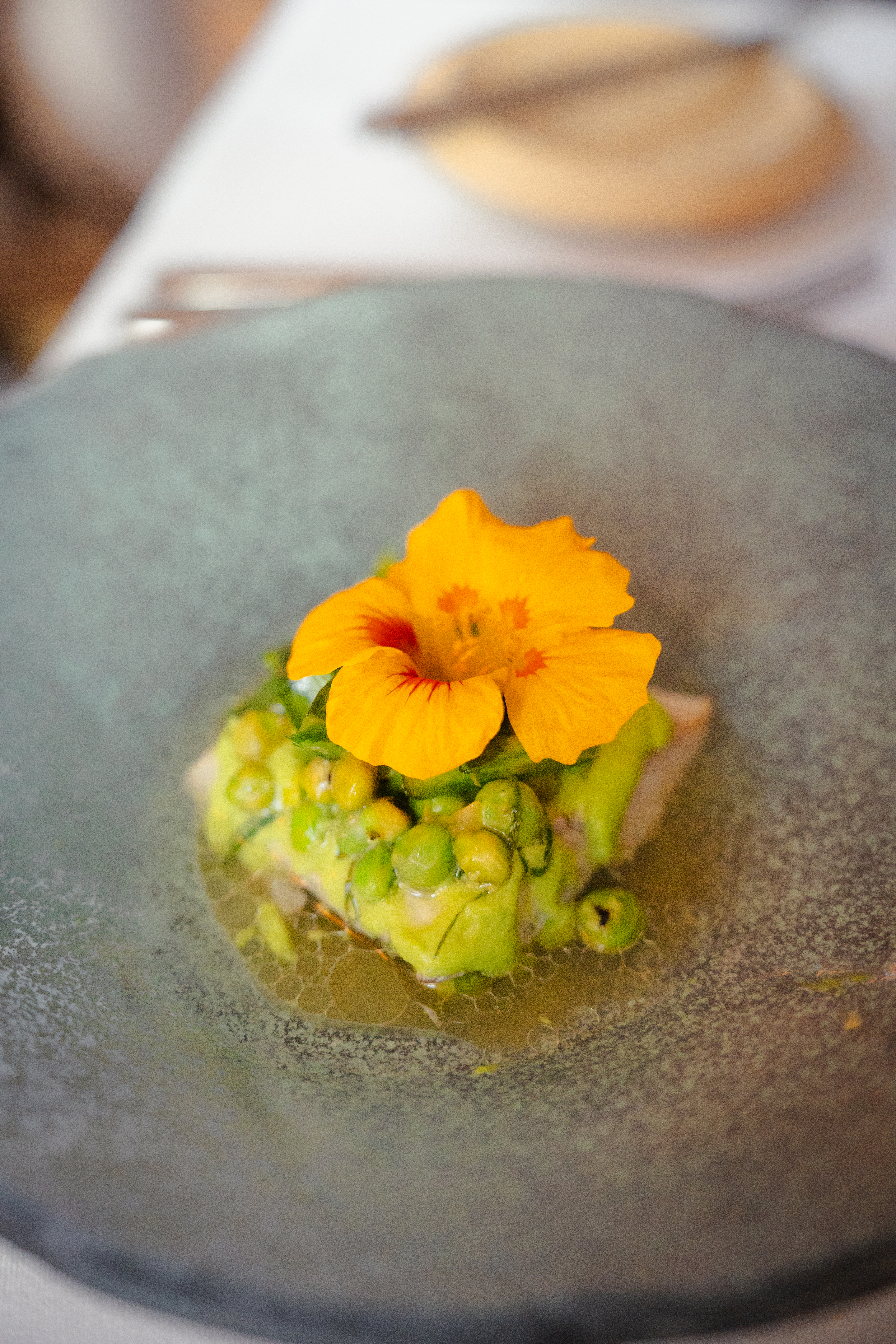 De barbecue-zeebaars heeft een lichte rooksmaak en is perfect gebakken. Samen met de crème van doperwten en het lamsoor is dit gerechtje uitstekend in balans en erg smaakvol.