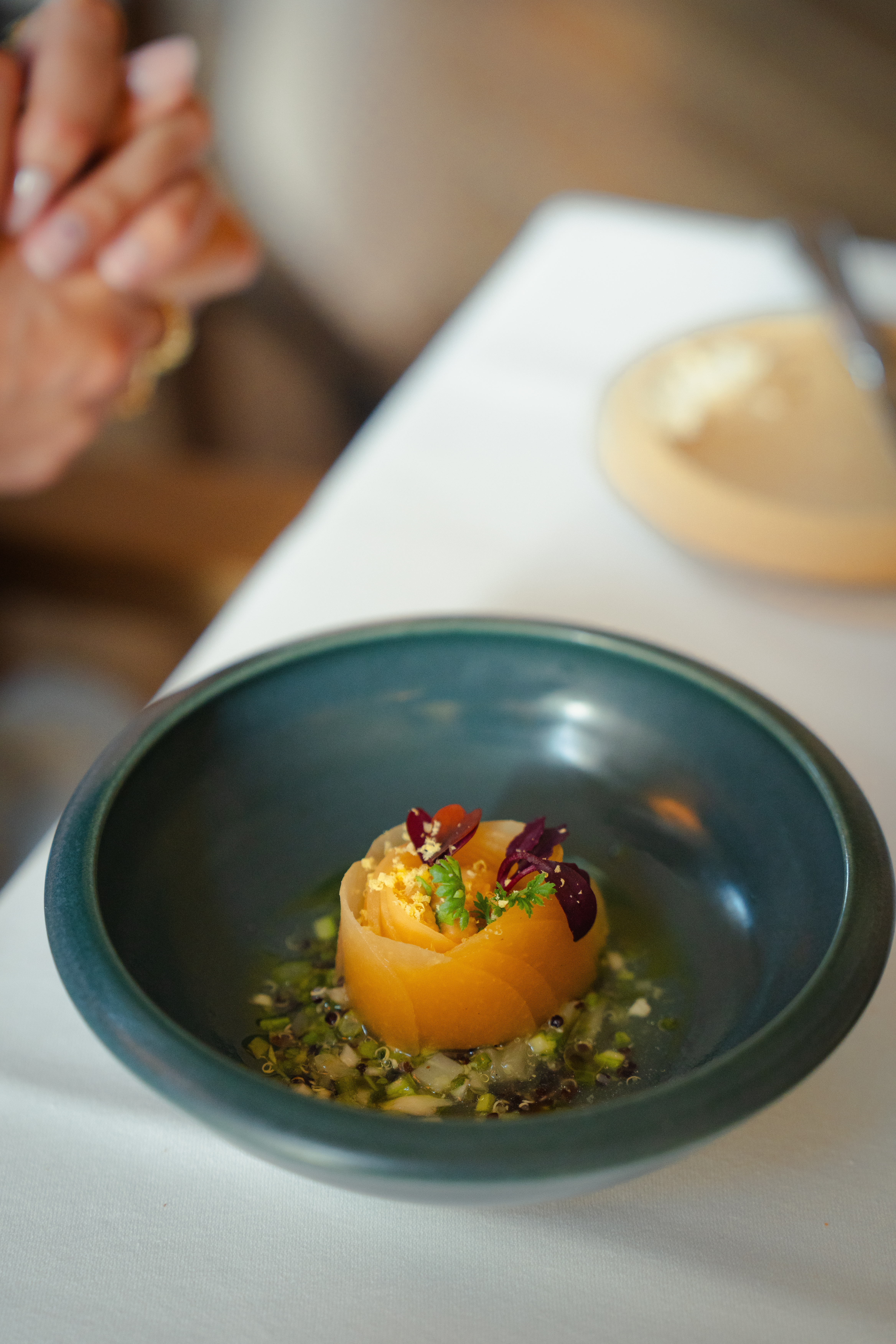 Vanavond eten we het 6-gangen chef’s menu en starten we met een gerechtje met makreel, rettich, radijs en een romige citroencrème. Gevolgd door een tot een roos gevouwen koolraap die gevuld is met een salsa van quinoa en groene asperge.