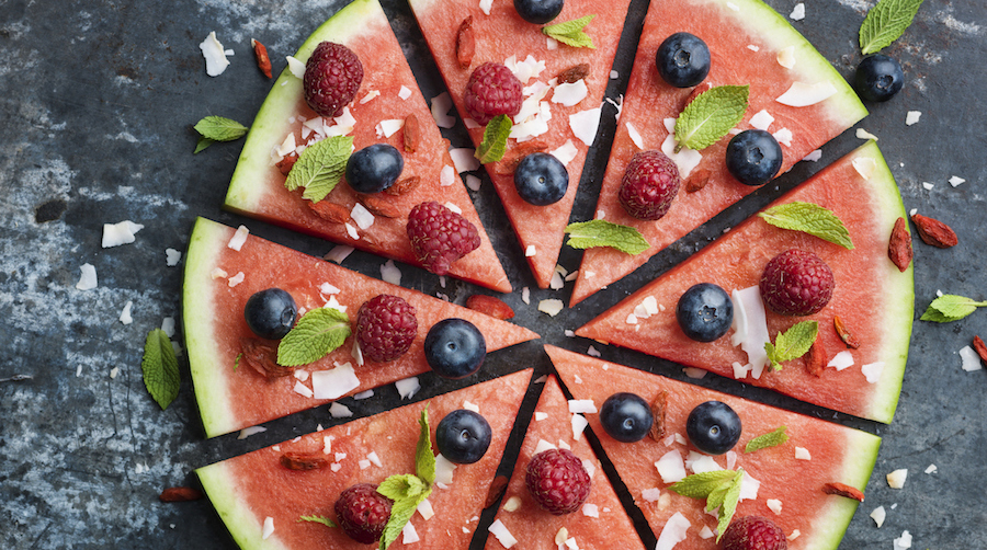Lekker gezond: snijd een schijf van het midden van de watermeloen. Deze schijf verdeel je in zes parten, alsof het pizzapunten zijn. Het ‘beleggen’ van je watermeloen pizza kan met allerlei soorten lekker fruit. Combineer bijvoorbeeld frambozen, blauwe bessen, goji bessen, een paar blaadjes munt en wat kokosschaafsel met elkaar voor een heerlijke zoete bite.