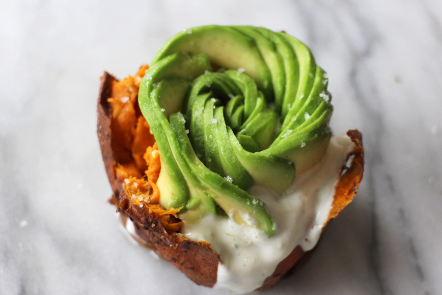 9. Gepofte zoete aardappels met avocado en limoenroom