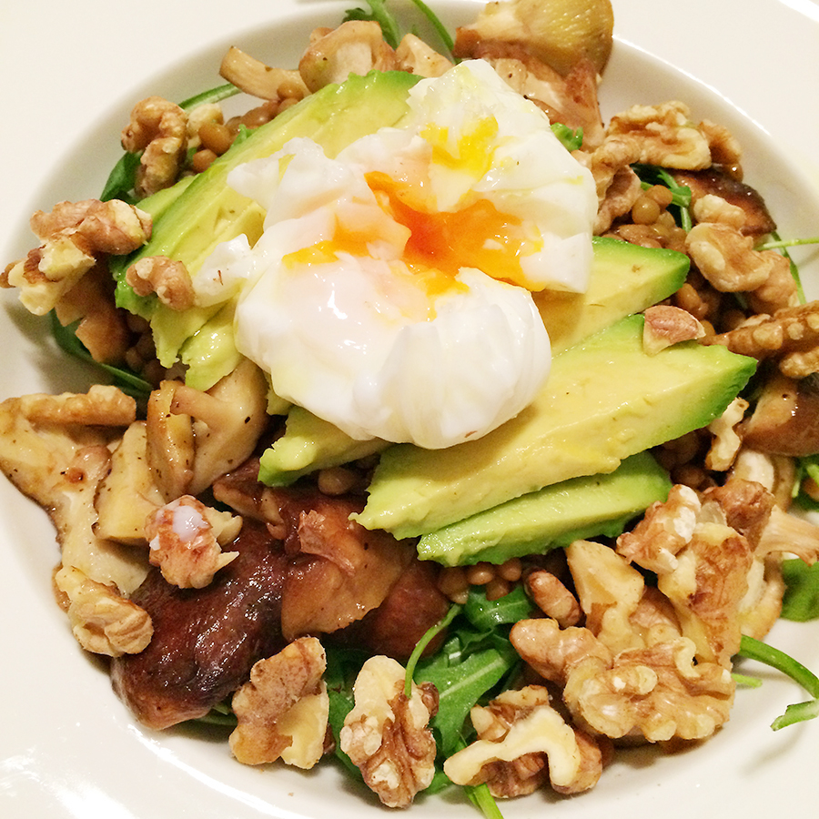 Een ander gerecht uit de Culy-keuken is deze lauwwarme linzensalade met shiitake paddenstoelen, rucola, walnoten, avocado, een knoflook-tijmdressing en een gepocheerd eitje.