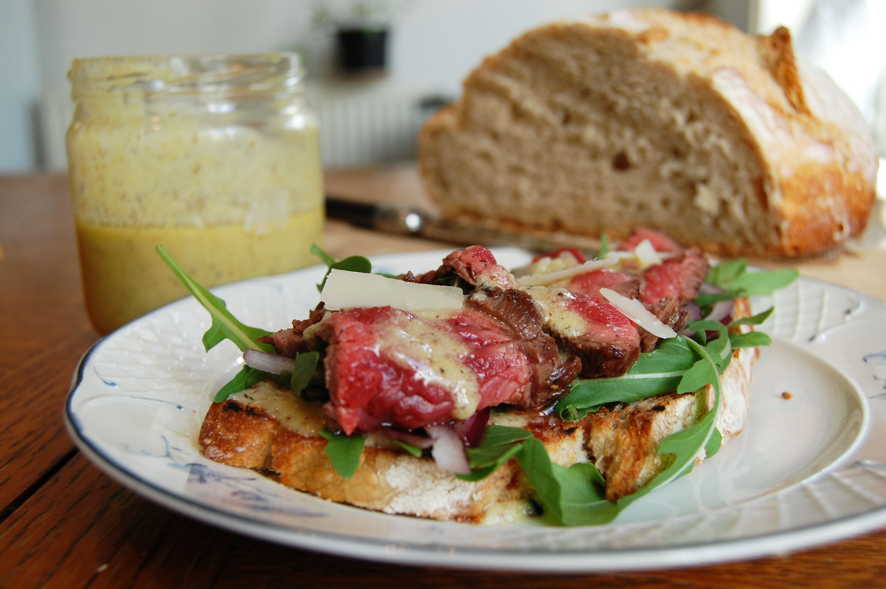 Voor een heerlijke lunch: een broodje steak met een dressing van Parmezaan.