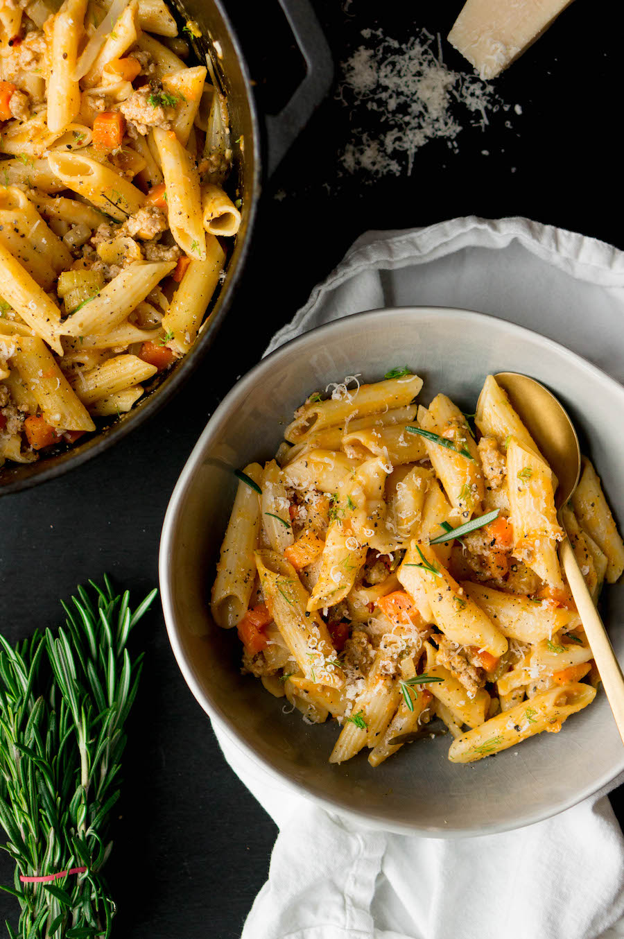We beginnen met een ultiem comfort-food gerechtje, want een pastamaaltijd gaat er bij ons altijd wel in. En al zeker als er pompoen, venkel en worst bij aan te passen komt, want je hebt geen idéé hoe lekker die drie samen smaken. Snel, smakelijk en zuinig (want je maakt ’t gerecht in één pan!): ideaal voor na een verfrissende herfstwandeling.