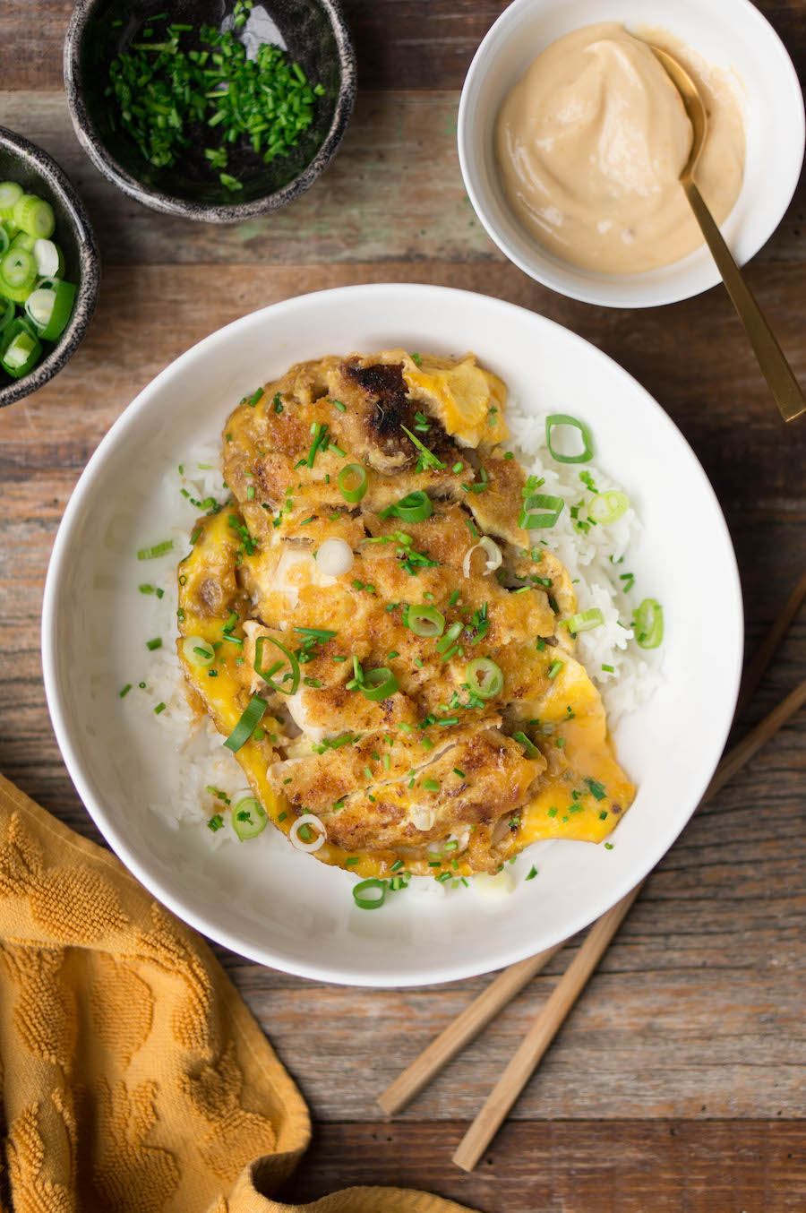 In Japan noemen ze dit gerecht oyako don. Dat betekent letterlijk ouder & kind rijstschotel, omdat er zowel kip (de ouder) als ei (het kind) in dit recept gaat. Superlekker, vooral ook met de miso-mayonaise.