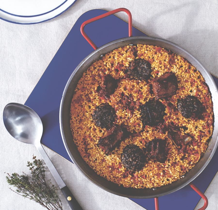 Alsof je op vakantie bent in Spanje: zo smaakt deze arroz con costillas y morcilla. Of, in Nederlands: rijst met spareribs en bloedworst. Het recept komt uit het fijne boek Brindisa van Monika Linton.