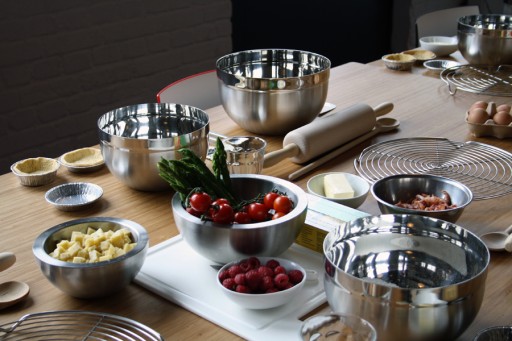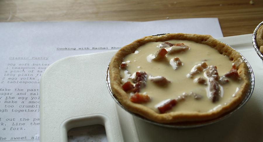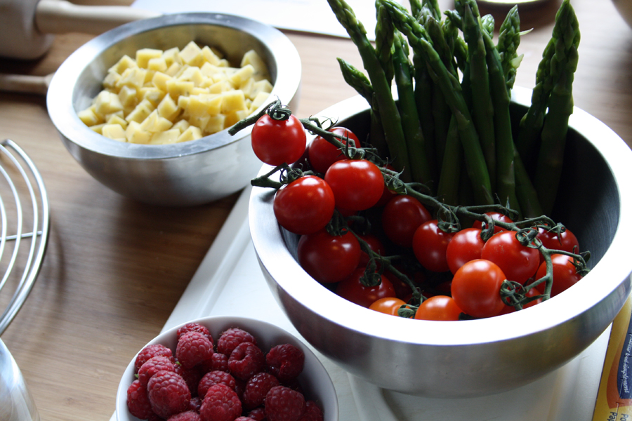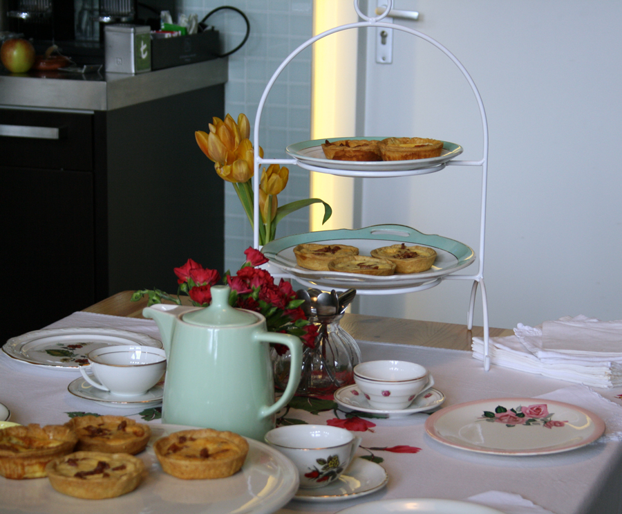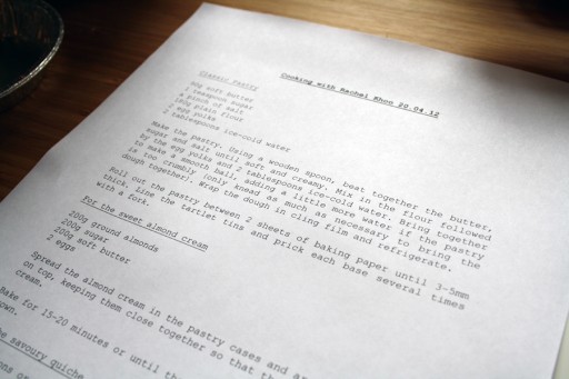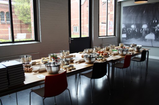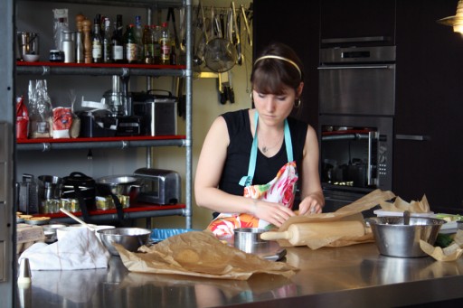 Na het interview arriveert de rest van de groep; culinair journalisten van onder andere Glamour, ELLE Eten, Cosmpolitan en Jamie Magazine. Onder begeleiding van Rachel, die alles uitgebreid voordoet, maken we Quiche Lorraine (traditioneel met room, spekjes en eieren) en tartelettes (kleine taartjes van zanddeeg) met crème d’amande (amandelcrème) die later afgetopt worden met verse frambozen en aardbeien en schijfjes appel.