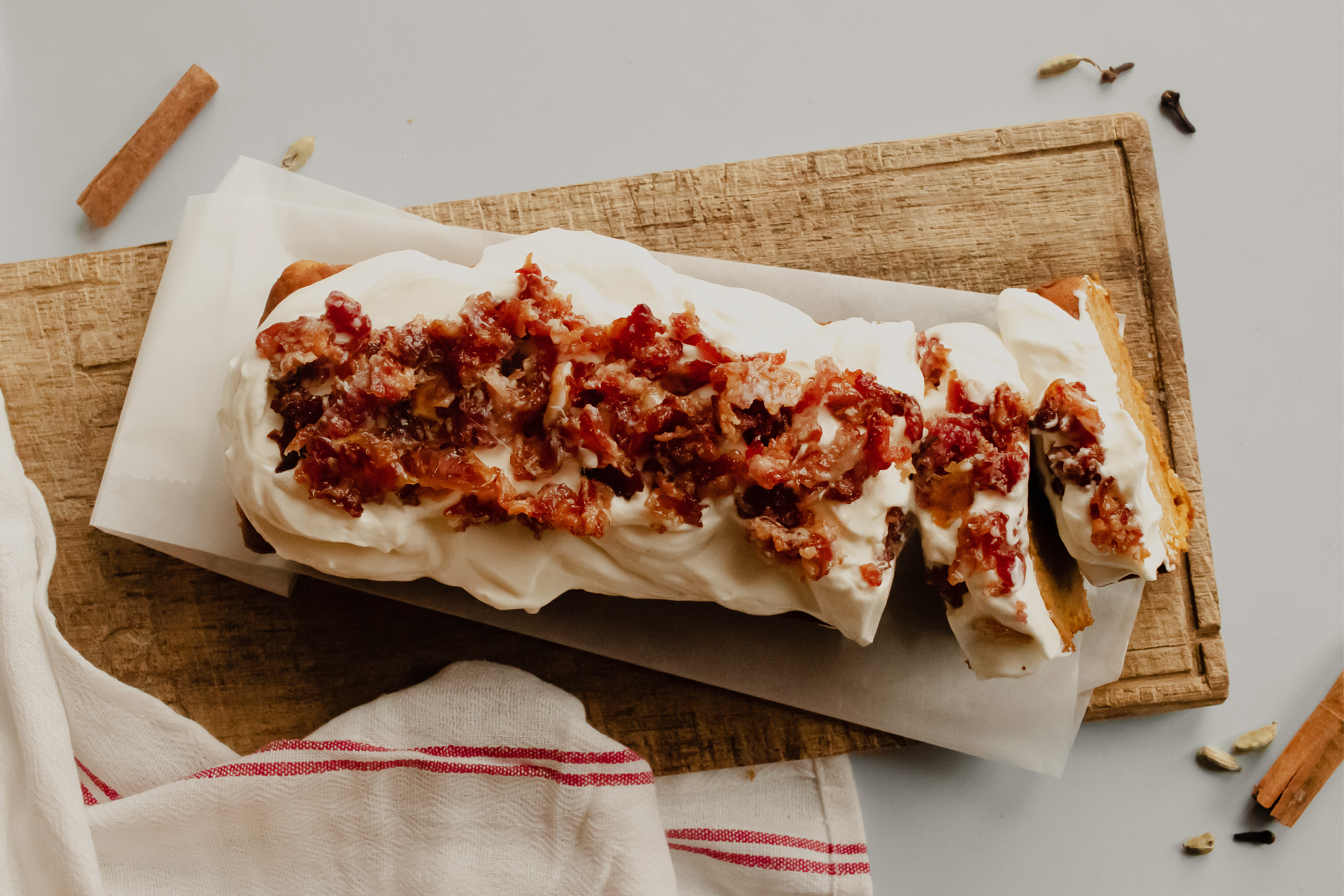 - Pompoencake met roomkaas en gekaramelliseerde bacon